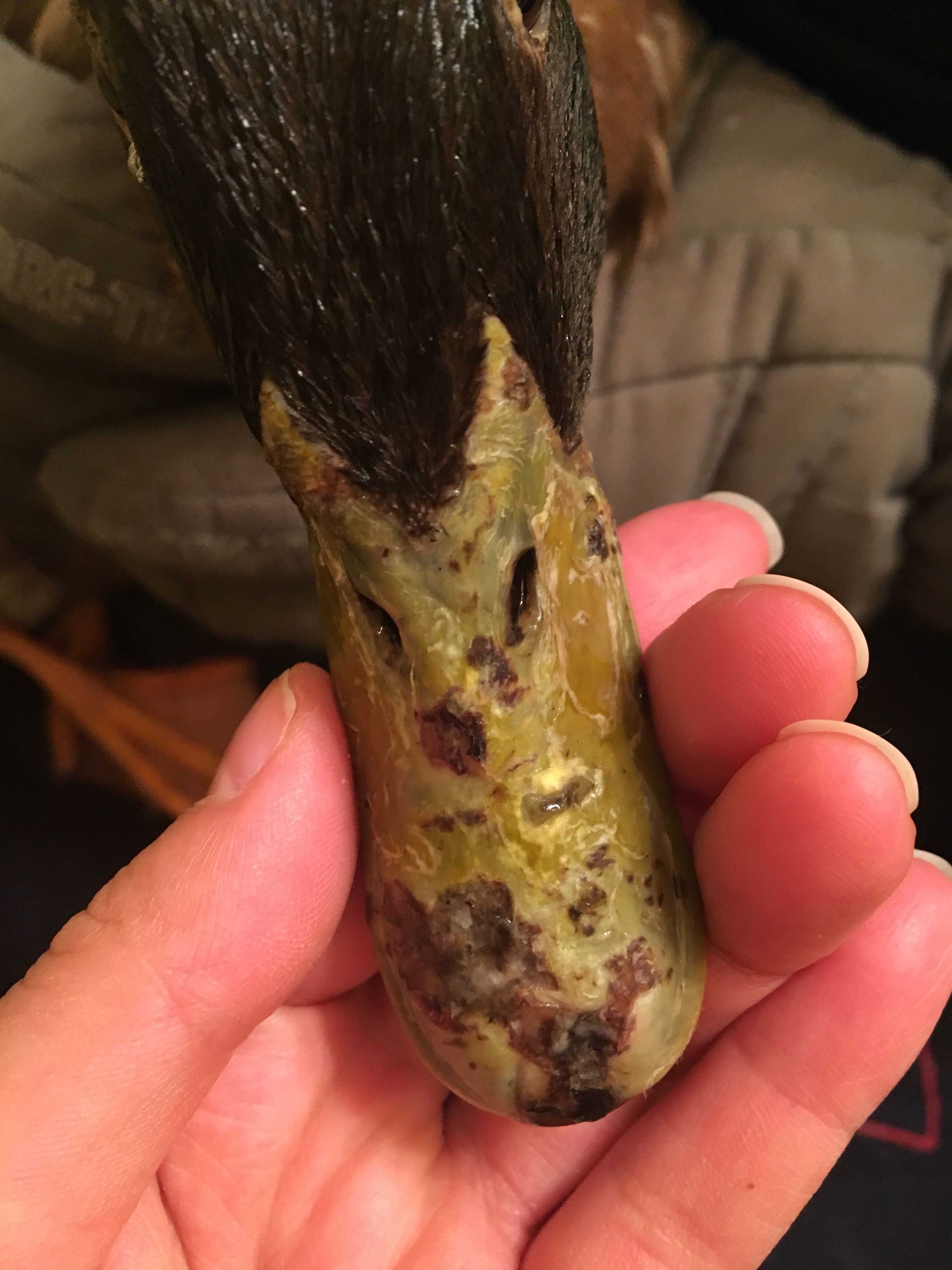 Hello, I noticed recently some strange things on one of my male duck's beak and in his eye. I'm just trying to get suggestions on what it is and how to treat it. I'm pretty new to owning ducks. I have only had the 4 that I own for a year now. The first picture is of his beak, he doesn't seem to be in pain when I touch it. We cleaned it off with some hydrogen peroxide. Next his eye has been having some white, foamy discharge in the corner of it and he is losing some feathers around both eyes. I also noticed some feather loss on the back of his neck and a small scab. We isolated him from the other ducks for now and gave him some warm water to clean off in.