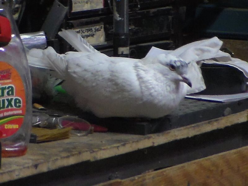 Hi. This bird was in my garage Thursday afternoon.Didn't appear injured or sick. It wouldn't leave today. I have it in a large wire dog crate, as I couldn't get it to go anywhere but back into garage lol. I have a roaming flock of Bantam chickens with a rooster, 2 cats, and a large dog, I don't want to shoo off a king pigeon to its probable death, but I really cant afford another pet either. Please help. It has red feet and is kinda short and stocky. Ill take a picture of it standing tomorrow if that helps, thank you so much.