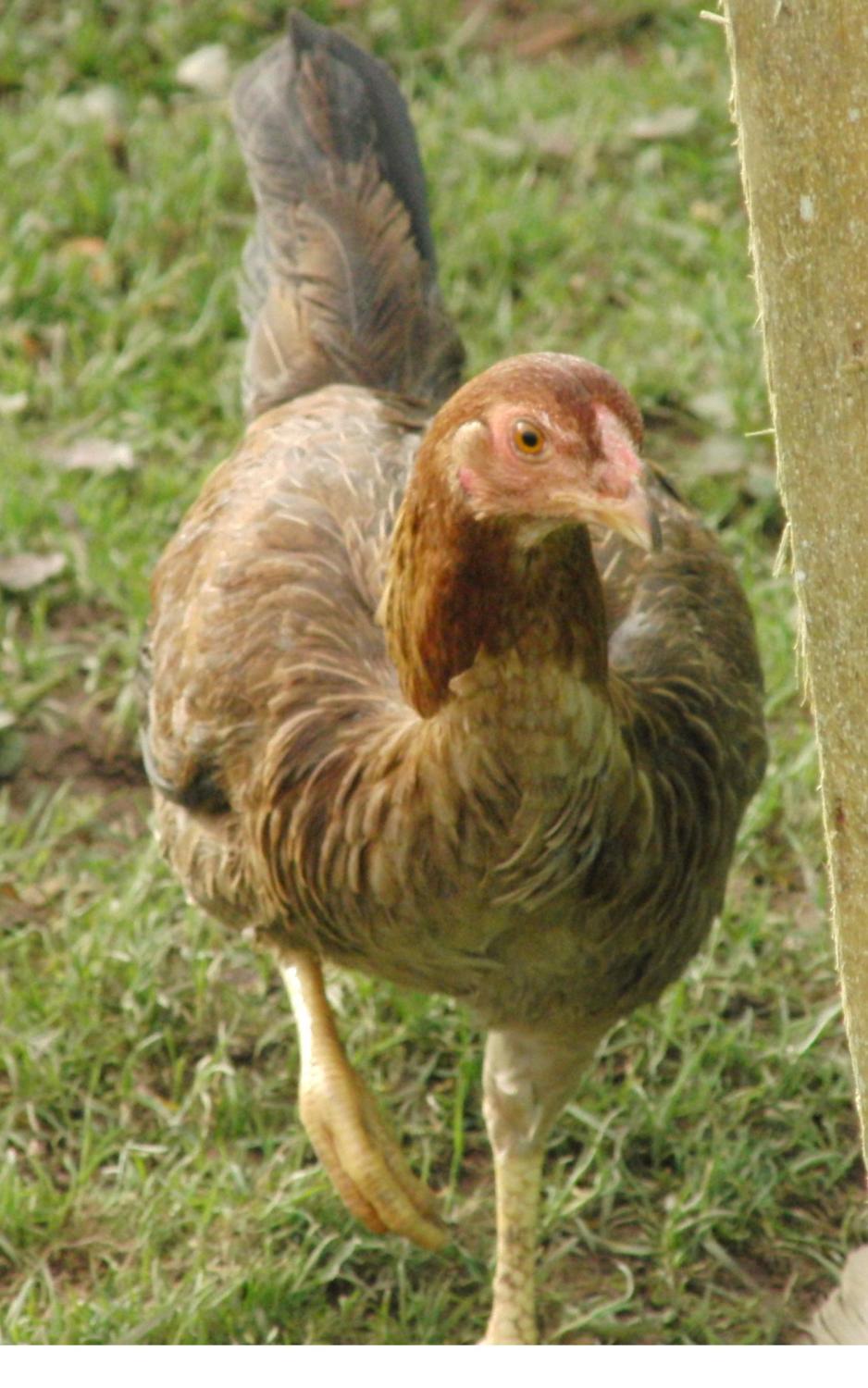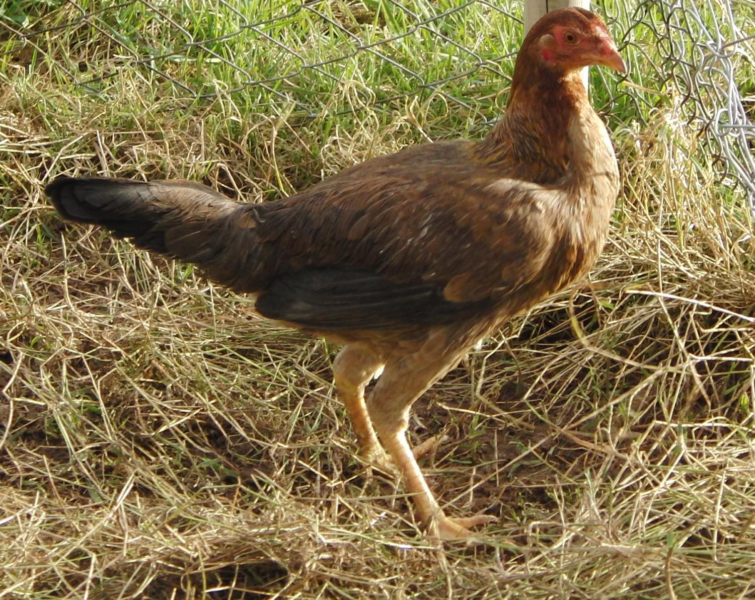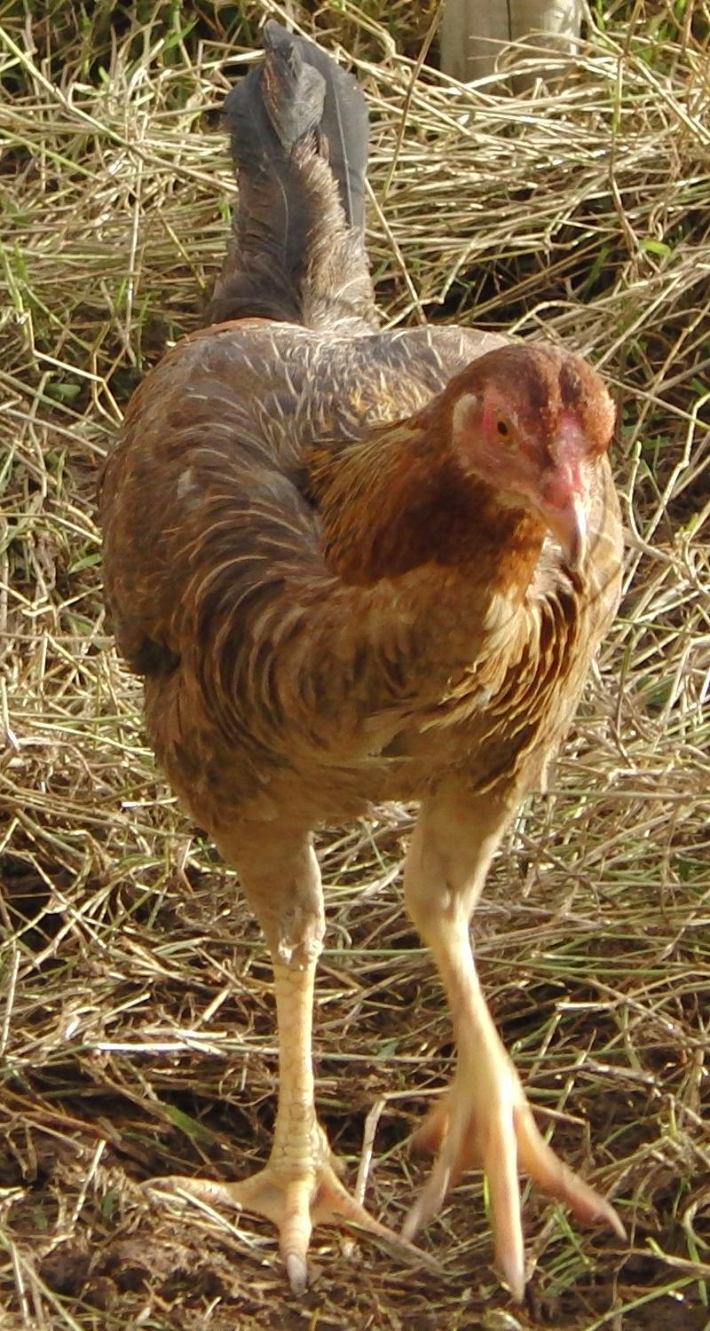 Our girl (I'm presuming it's a girl by now...but I guess ye can help tell that!) is doing fine, doesn't really stay near the other hens/cock but there are 2 ducks there which she likes to "boss" around