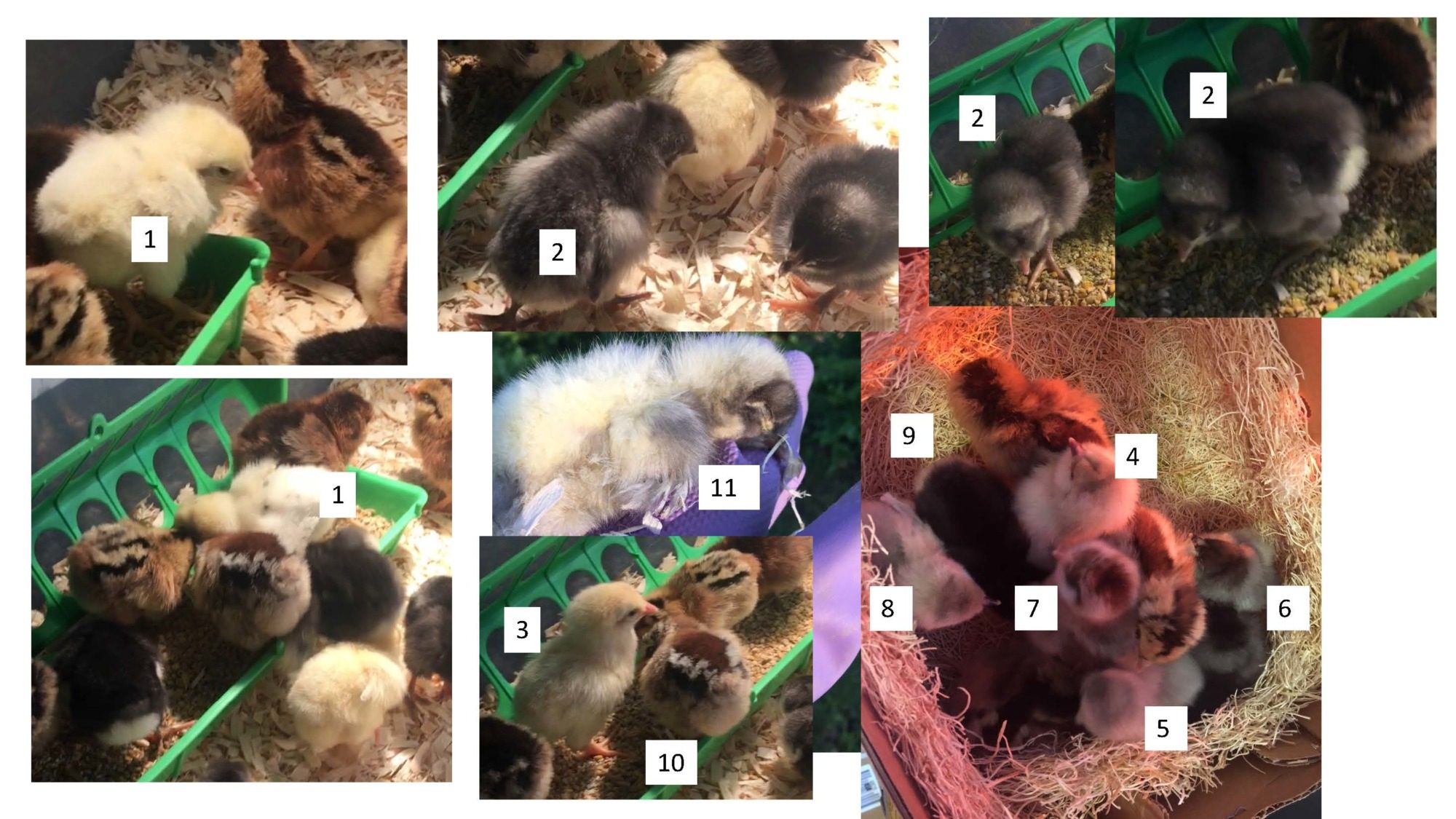I believe the three chicks that aren't labeled are the easter eggers (brown with stripes on backs). In this box there should have been the 3 EEs, two Lavender Orpingtons, two Blue Ameraucanas, and two Olive Eggers. I thought it would be easier to tell the Opringtons apart from the eggers/ameraucanas, but the little black and yellow chick (#9) and #6 threw me off. #5 and #8 look pretty similar. Are 6 and 7 the orpingtons because they have the dark spots on their heads? Who is #9? I'll try to get a better photo, but he has a yellow bottom and the rest is pretty black.
