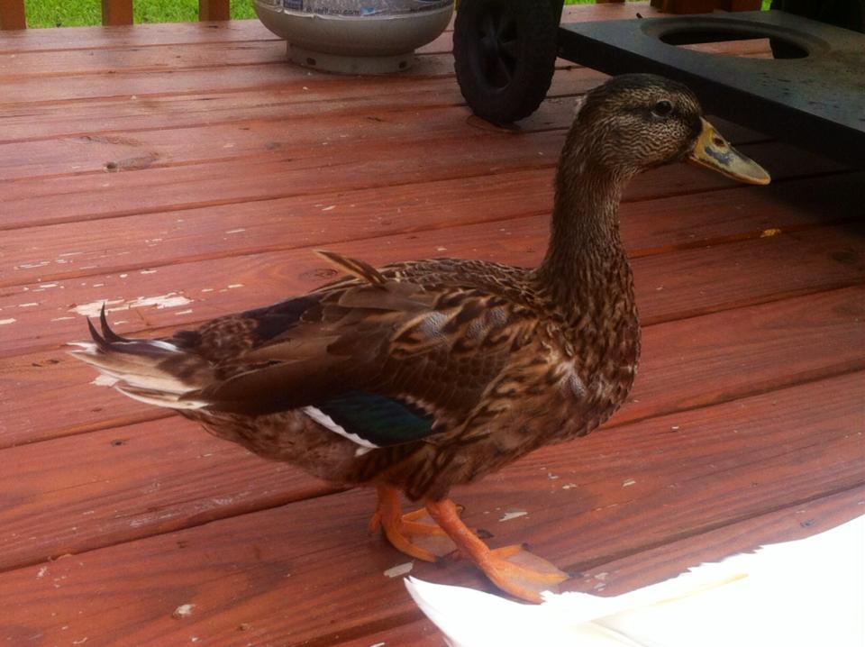 Some background on the duck: the original owner got 6 babies from a feed store and was told they were mallards (which is what she was specifically looking for) in early April of this year...she thinks they were roughly 10 days old when she took them home so that would put the ducks being born around late march maybe the first of April making this duck almost 6 months old now. In early May, the ducks got sick we think with a bacterial infection (they presented as being very wet when they hadn't been in water and then within hours they started to die). This duck was one of the healthy ones that was immediately quarantined...the original owner gave her to a second owner for safe keeping. All 5 of the other ducks died unfortunately and the original owner was heartbroken (this was her first time raising ducks) and the second owners agreed to keep the duck permanently. This duck never came down with whatever sickness killed the other ones. The second owners had the duck a few months when they realized they would be going back on the road very soon and their quite nomadic lifestyle would likely be extremely stressful for this type of animal. They did everything to find a good home including calling the humane society and luckily found out that I had ducks and was looking for a new duck to add to the family a few days before they had to take off for a job. So now the duck has joined my merry little band.