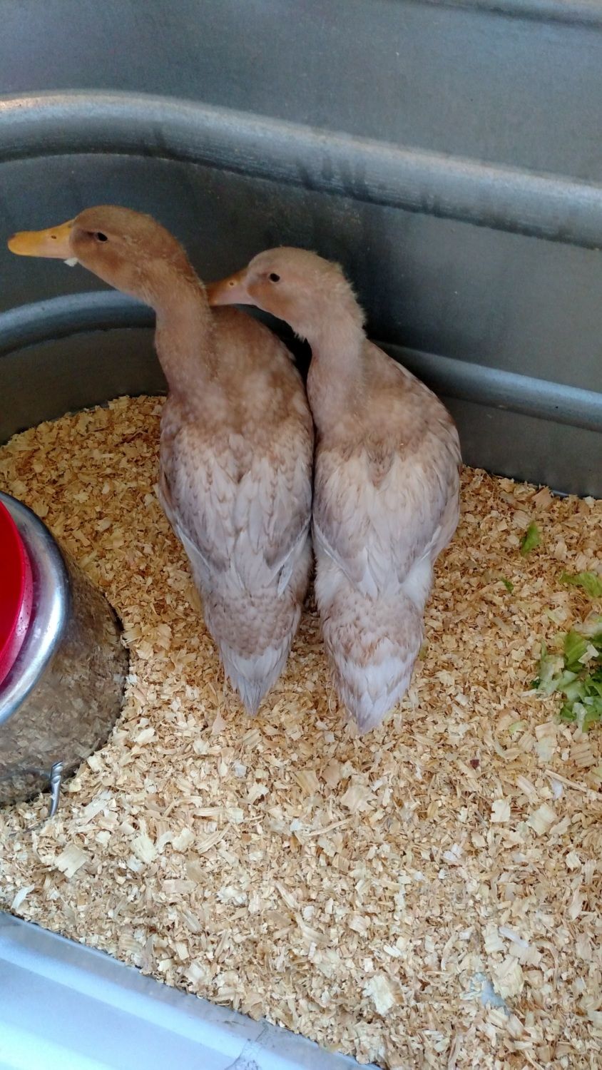 I was wondering if anyone could help me identify my ducks? They're about 4.5 weeks old now. When they were ducklings, they were all yellow. Two weeks ago, they started getting white feathers (I was sure they were Peking Ducks) - however their feathers are now coming in brown. Their breasts are a light brown, and their feathers near their tails and wings are white and brown. Their beaks are a light pink/brownish color. Here is a picture of them!!! I am starting to think they are Welsh Harlequins but am still not 100% sure. Any guidance would be greatly appreciated!