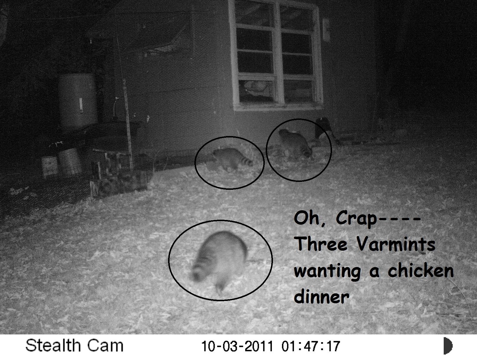 Unfortunatley, Saturday night we decided to put them in an older coop of my uncles that was wooden and off of the ground. It seemed secure enough. It had 1/2" mesh wire and all of the works. The wood was particle wood (which has proven to be the problem) so we thoght it was safe and time to let the birds back out at night....