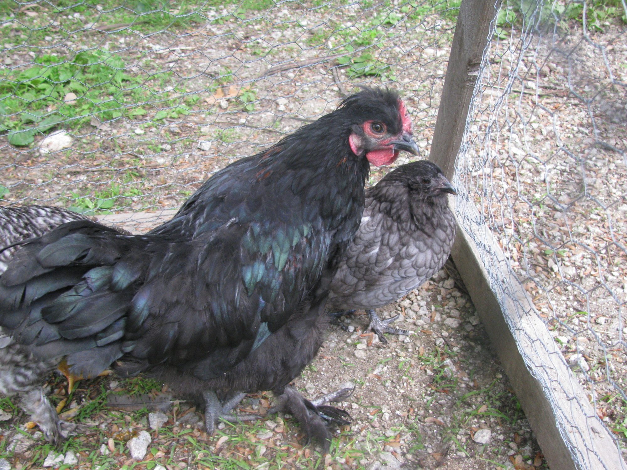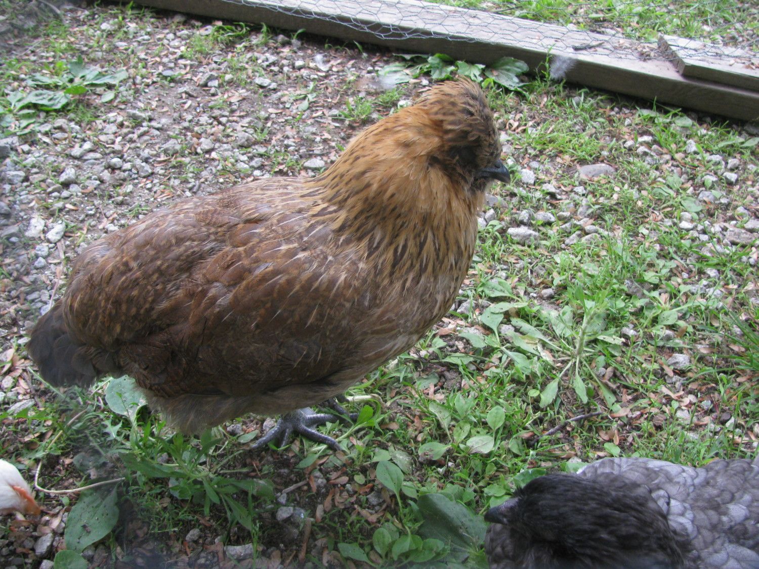 This black one is Lady Jane. She has feathery feet, so maybe part silkie? Also, she has a "funky hairdo" as my kids say.