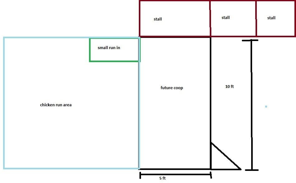 This is a very CRUDE drawing of the coop. We are relocating it from it's little metal shed into this barn/tack room. Dimensions on the insde are 5x10. Where the triangle is is the door. It does open out so that frees up the space on the wall. The "barn" itself is really an L shaped structure so anthing that is not boxed in is open to the field. We do not have any other animals at this point but plan on having cows. The front 5 ft section and the 10 ft section with the door will be open to the pasture where cows will eventually be. Because of this, the nesting boxes will need to be INSIDE the coop, as much as I would love to have the ones where I can just lift the flap and get them out. UNLESS I decide to do that and have the boxes stick out into the run.