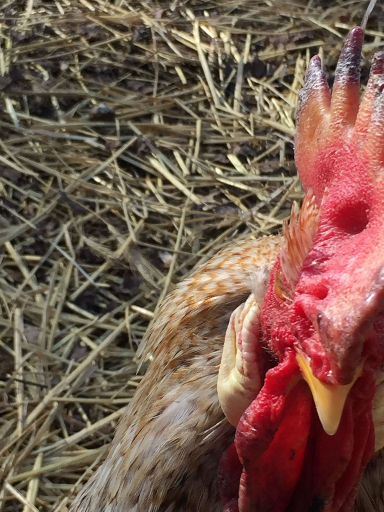 My Bielefelder Roo has the black on the tips of his comb, but nothing like the Crested Cream Legbar. I gave him a coating of Bag Balm as well - I have it in the house for my fingers which crack in the cold. Kaiser looked like he was wearing earrings because he got wood flakes on his wattles!