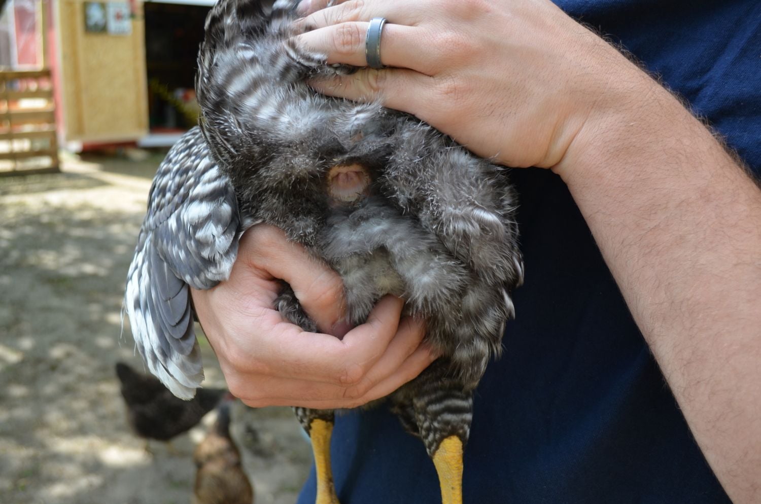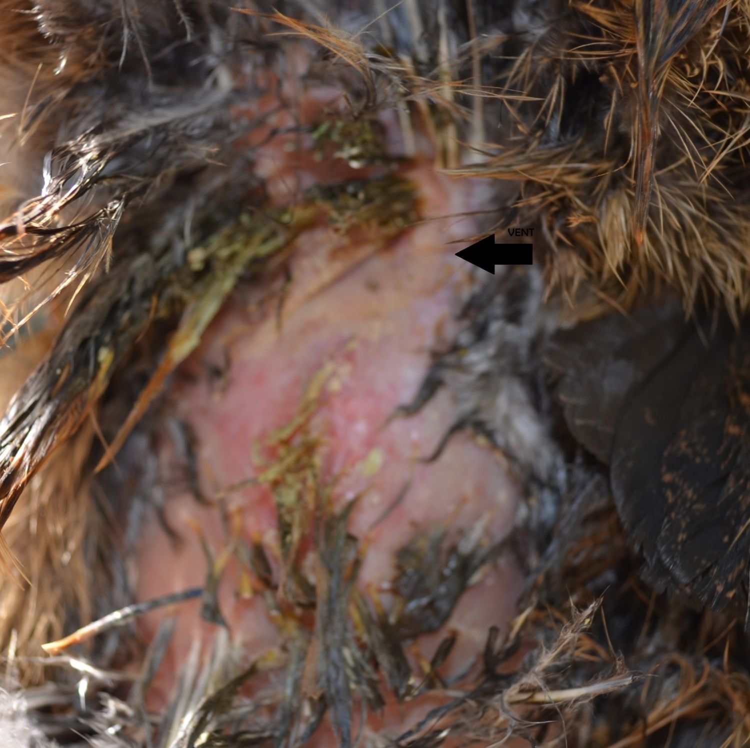 About 2 weeks ago we noticed she had poop hanging off her tail end (thinking diarhea). When we went to wash her off, we noticed that her vent was a real light flesh colored (our other's are more pinkish) and it is turned sideways! I don't know if this is genetics, possibly an injury for a hatchery sexing, I don't know. But we guessed this was why she was getting poop everywhere. It is getting worse because we cleaned her again a few days ago and it was a mess today. We ended up having to cut some of her bottom feathers because they were matted with poo, and washing her off. (This photo was snapped real quick while doing it, that's why there's poo, she is clean now).