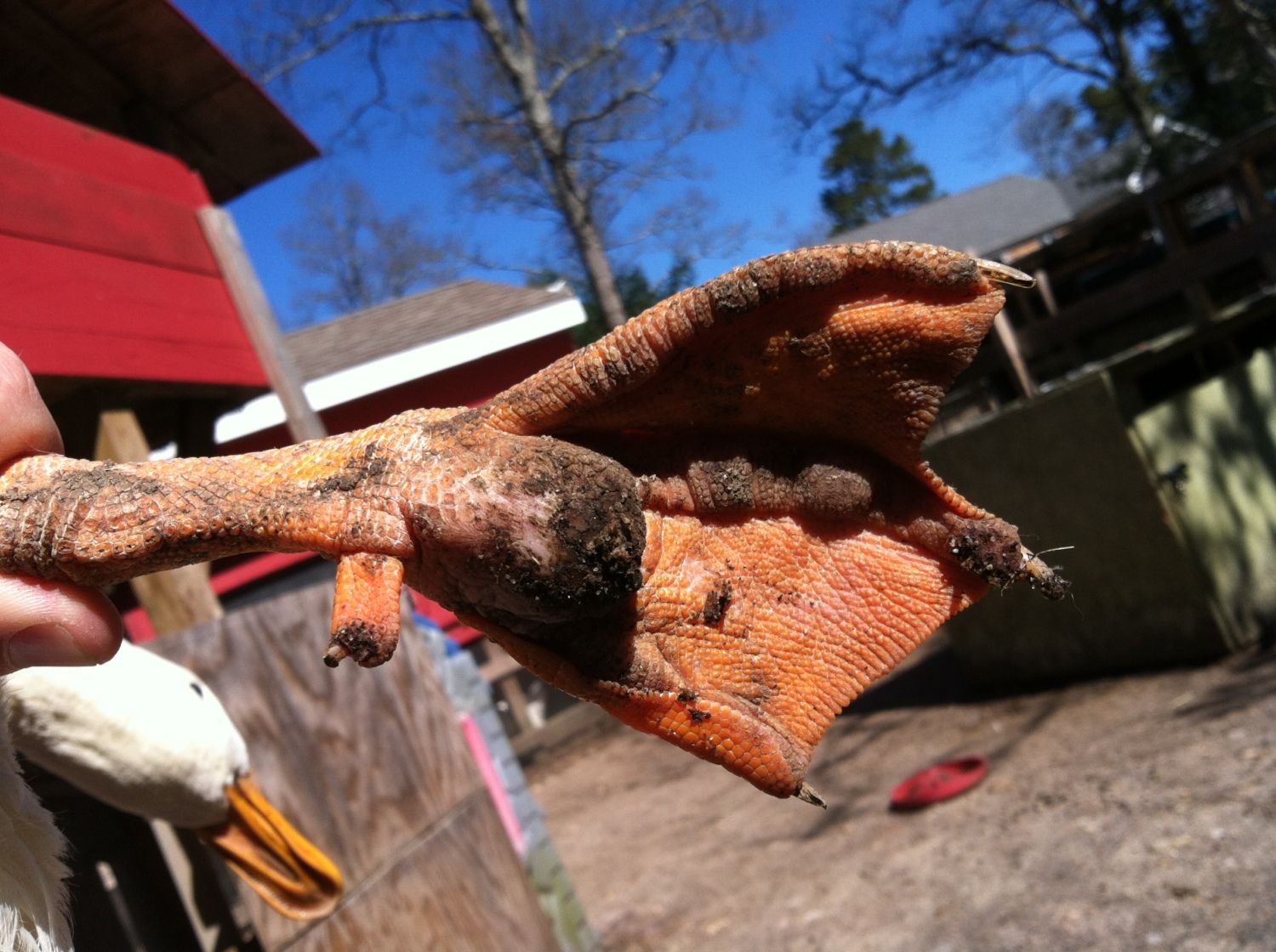 epson soaks,antiseptic (bactine or even better is Dettol solution for cleaning during surgery) and iodine or polysporin in gauze wraps during healing. I gauzed her bumble woulds heavily with polysporin or iodine and wrapped with that sport wrap (sticks to itself. Wrap just as the duck would stand on a normal foot...toes spread flat...not squished together. They pull at it ...so tape with bandage tape with the edge at the back or wrap around a few times...if you see their feet are not staying flat you can cut a square or circle of cardboard and place it after gauze to stiffen shape before sport bandage wrap goes on. Lots of rest---- greeeeeens! high protein duck feed and clean water and duck gets alone alone time...other ducks will bother the injured and wear them out...isolate and visit often. they will walk funny at first but then get used to it. do not put bandaged ducks back outside or in messy conditions. And for the others...time to make sure they are on dry ground at least during nightime hours...ducks can take wet of course but not 24hours...their winter callusses swell and crack and bacteria get in and voila..bumble foot...most often seen in the spring...when we all struggle to keep things tidy (especially here in Ontario Canada) I've almost perfected my duck management (pat on back