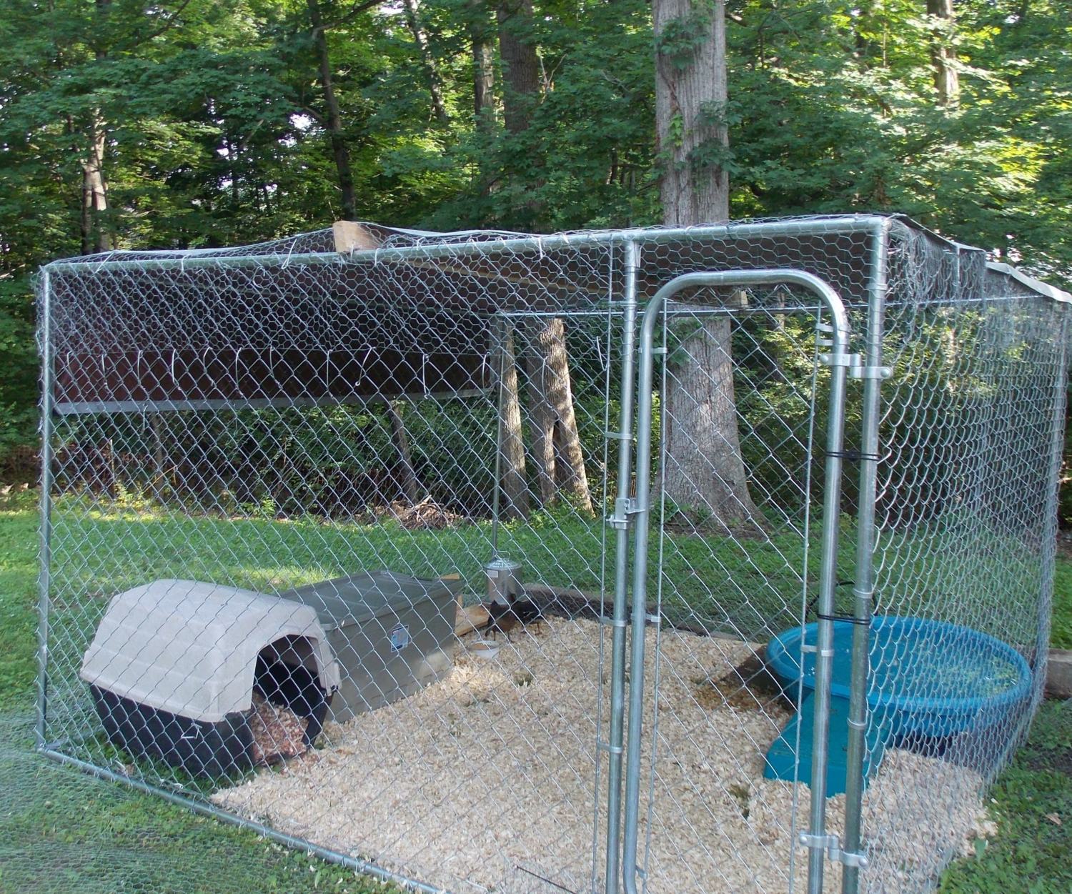 I just used a 10 x 10 dog cage for my two female mallards. I wanted something I could stand in, for when I clean it. I have tarp on the top and chicken wire on all sides and the top for extra protection. We live in south Ohio where it can get cold, so we use tarp on 3 sides and half way down the other side for the winter. Inside we have a dog house where they can get out of the wind, and we keep a lot of straw in there. (In this picture we used wood shavings, now we use straw) We use a heated water bowl. This picture is before we added the tarp on the sides. In the cold weather, we moved the pool to the tarp protected corner and fill the it with straw, and the dog house is beside it. They only use the cage at night or when it's really cold, or if I'm away and can't watch them.
