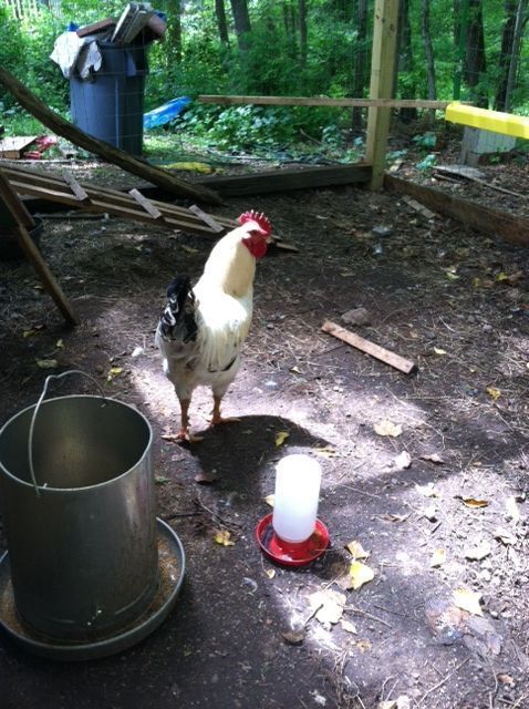 centrarchid - Thanks again for all your advice. My husband finally agreed to build the roo a small pen. Hopefully this week. For now he is doing his usual thing - strolls over to our coop at 5am or so and crows, then hangs out by my girls. When I first let them out in the morning, he chases them into the bushes (with me watching carefully), but for the rest of the day he does not bother with him, just sort of hangs around keeping a vigil.