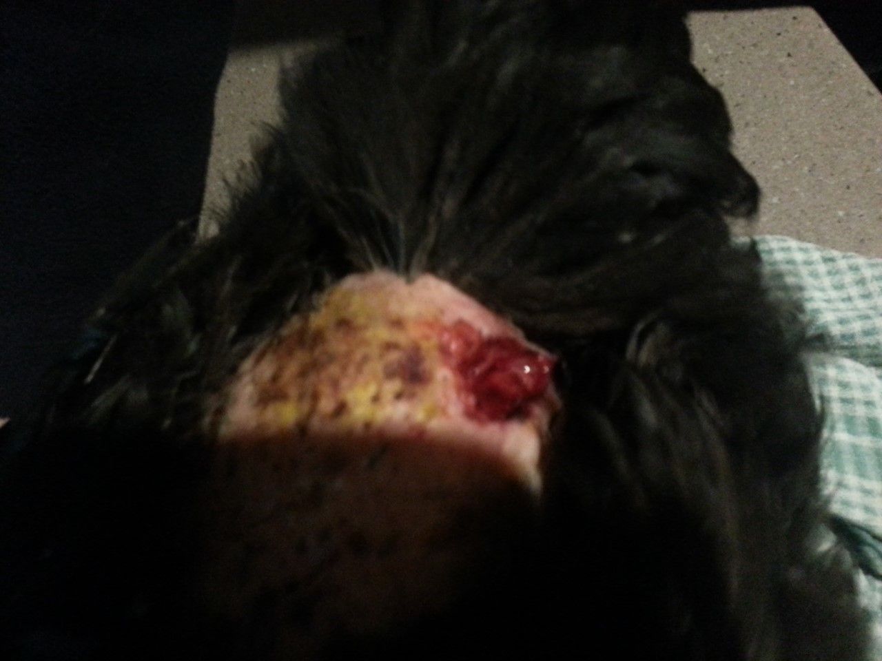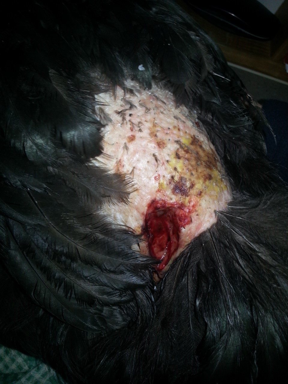 So last weekend I adopted two ex battery Isa Brown chooks to add to the family. I introduced them during the evening so they could wake up together. I watched them in the morning and besides a few pecks here and there, and chasing away from food...they seemed to be OK. Elsa is my Light Sussex and she is the biggest of the girls and she is the boss, the Isa Browns know to keep their distance but what I found tonight (I check them each night to make sure everyone is OK) is Rosaline my australorpe who has always been part of the group (but was always at the bottom of the pecking order) badly attacked on her back. I found her under the nesting box and when I got her out I saw this gaping wound on her back.