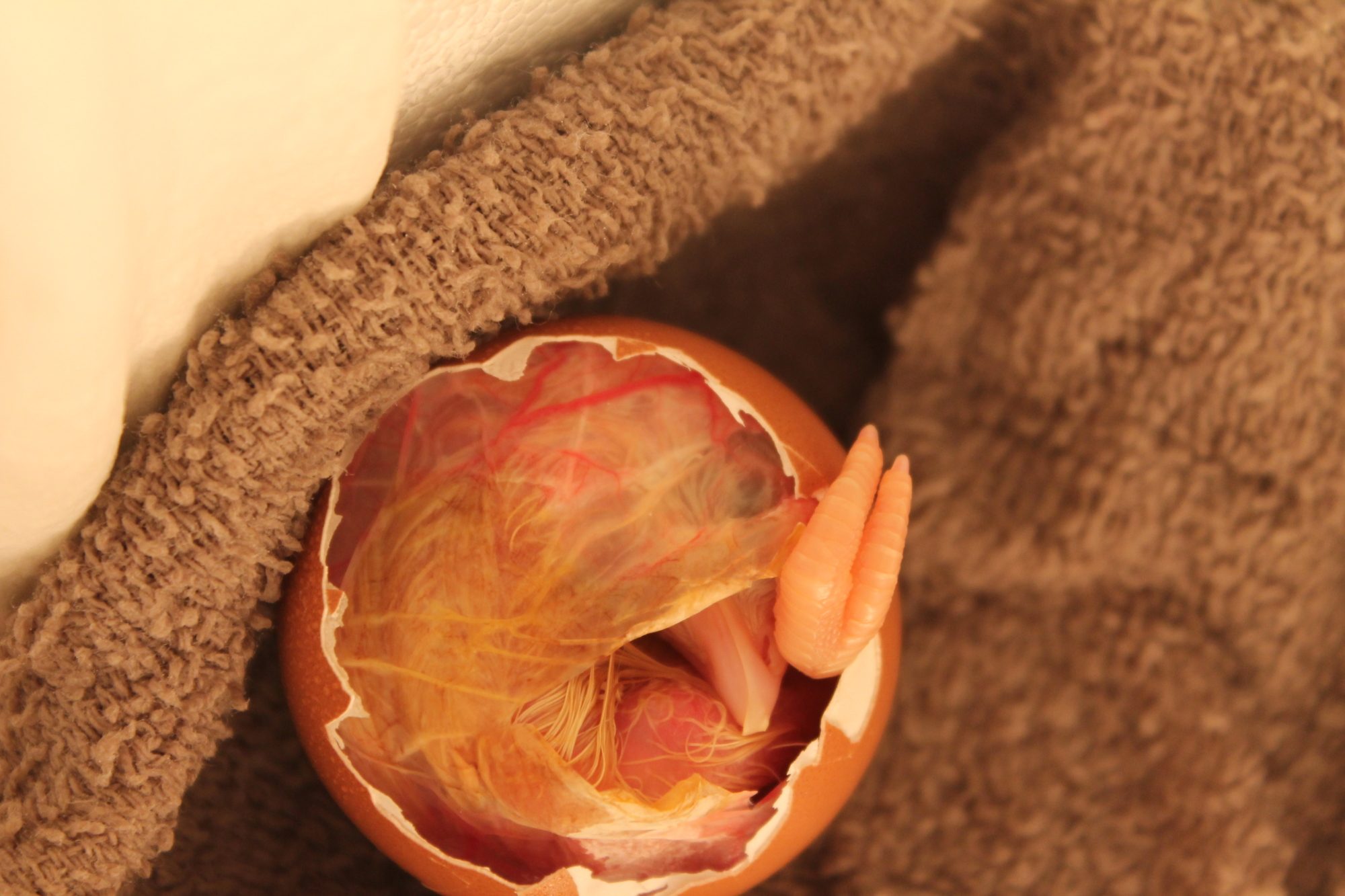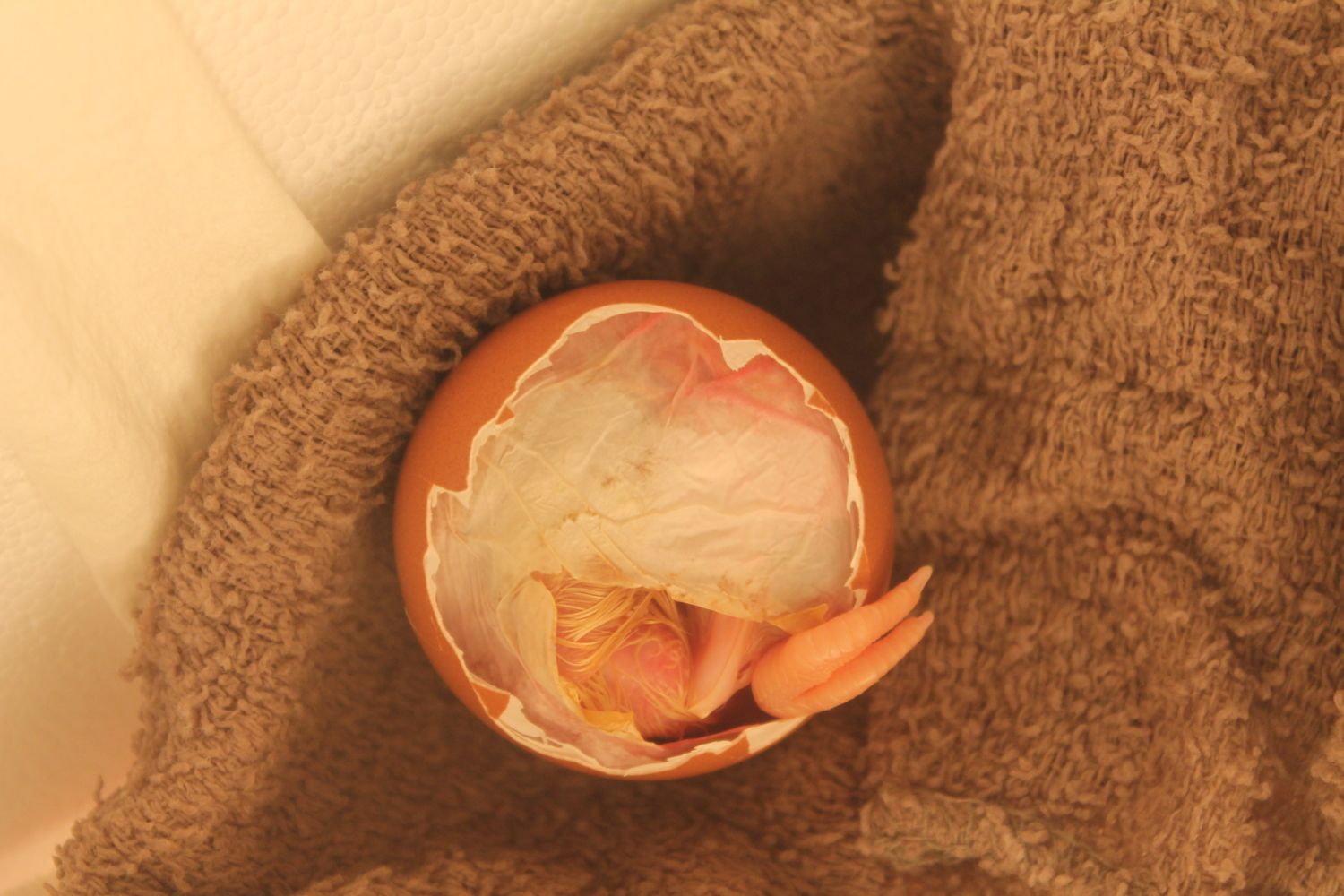 Here's how she is now. I pulled a bit of the membrane off,but stopped as soon as she started bleeding. The bleeding stopped, thank goodness. I'm leaving her alone for now. The other chicks still moving around in her shell. Hasn't pipped externally yet.