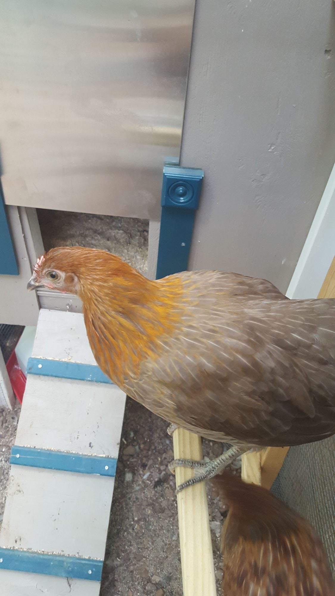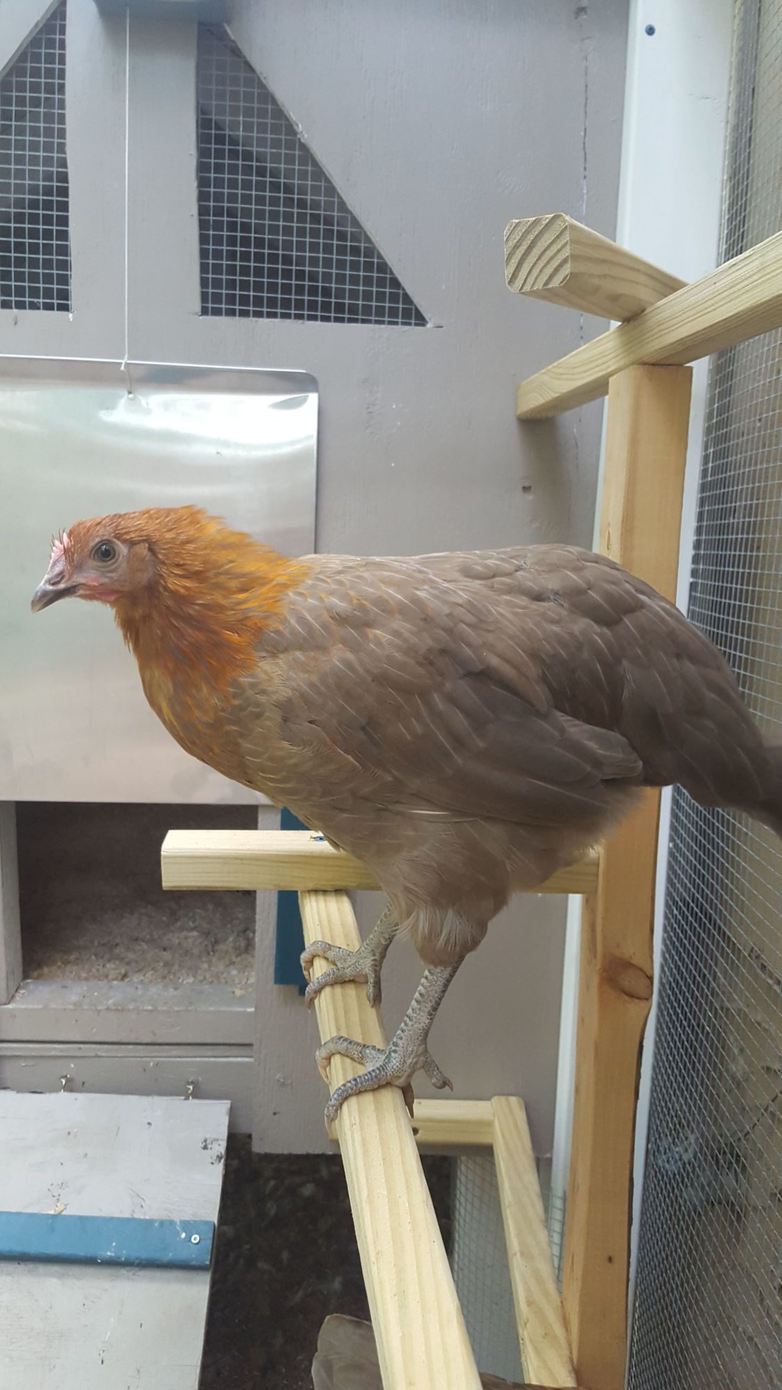 Hi all! My husband and I are 8 weeks into our time as chicken owners. Our 4 ladies are spending their FIRST night in the coop tonight! (Ahhhh---nerves!!) We have a beautiful blue-laced red wyandotte, an ancona, an easter egger, and Lorelai-----she is a mystery! She started out as a solid grey chick with blue/grey feet. Since then, she's kept the grey body but grown golden brown feathers on her head and neck. Any idea what breed she might be? I've attached photos for reference.