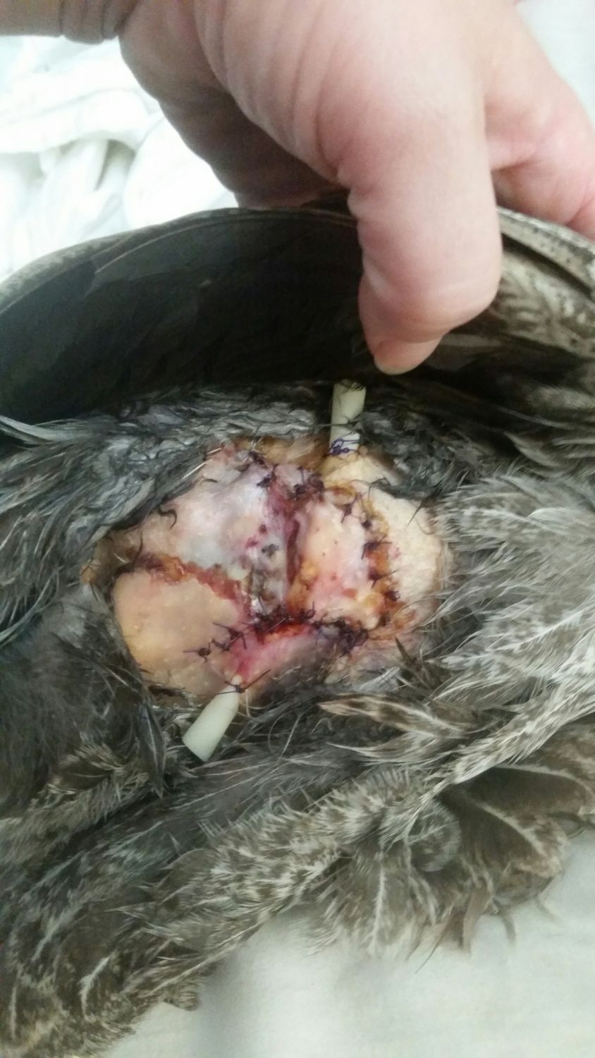 ok we just got home the vet did surgery on her i have not looked at myself yet she is still out of it from the Anastasia, he typically doesn't deal with chickens but because he is THE BEST vet in the world he done it. He said his biggest concern was putting her under but he had to in order to repair the muscle tissue and patch the skin back together. She is still pretty out of it and her breathing is labored but she is hanging in there. I will post pictures in a little bit, I first gotta feed my baby squirrel I'm nursing. I tell you we have the local Zoo and I love it lol