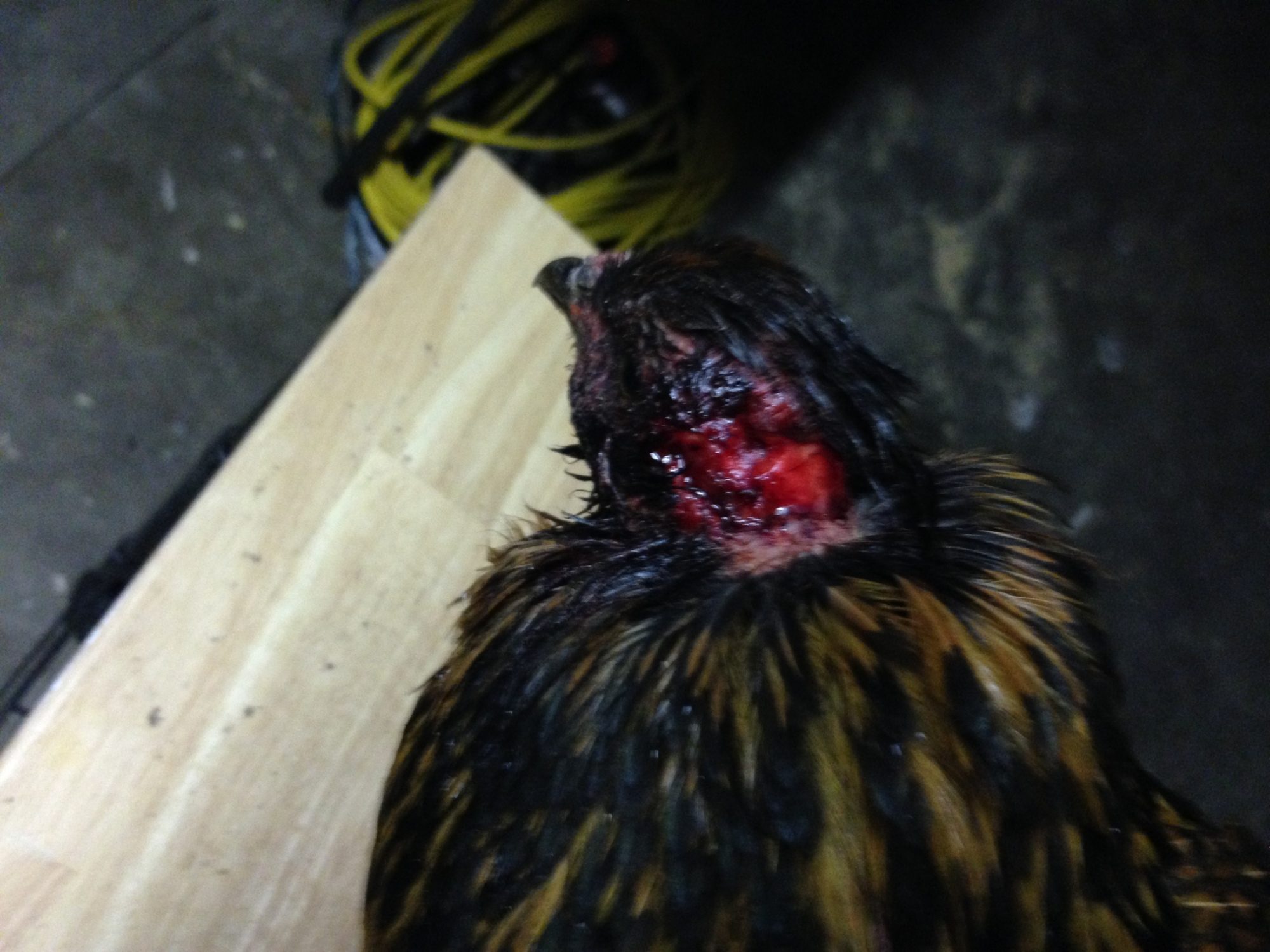 Quick background, we had 8 new birds mixed in recently with 5 1 year old hens. 1 new rooster in the mix. We decided to build all of them a new coop. The new coop and old coop are both in an enclosed, uncovered run. I've been leaving the old coop open for the sake of allowing the older hens to transition to the new coop, as it seems they prefer to lay in there. I got home after dark tonight to find some of the older birds roosted in the old coop, but some very watery droppings on the floor. Upon looking in on the other coop, I found the remainder of the flock roosted, but the one injured Americauna was clearly not doing well, with her head cut as the photo shows.