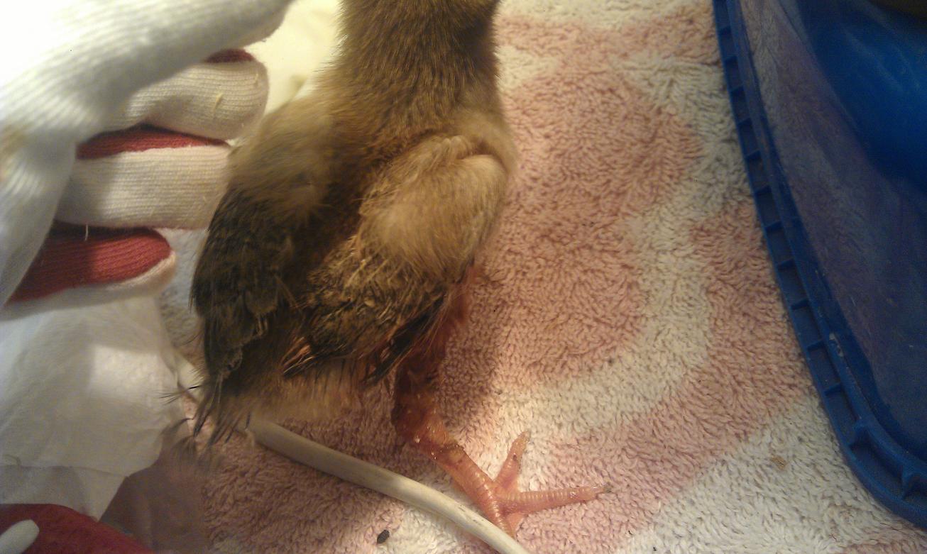 Ive used tripple antibiotic oint. Keep coating it on the wound and leave it open to the air make sure baby is warm enough with a heatlamp but enough room to get away from it so it doesnt cook I wouldnt give up till it would pass on its own