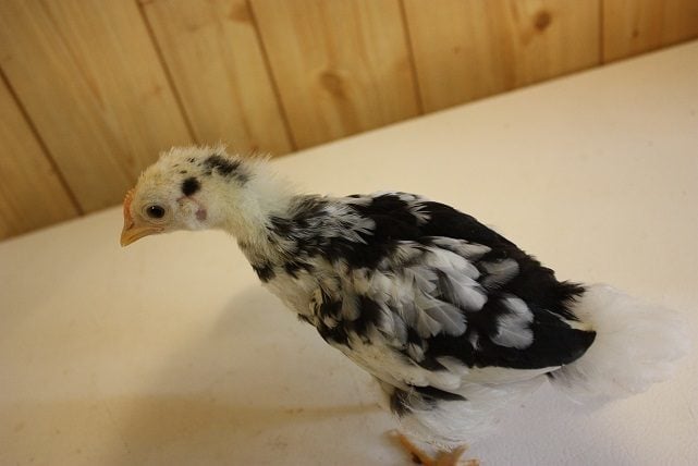 Chick 1 - a mixed breed (father is splash laced red wyandotte, we believe the mother is my speckled sussex)