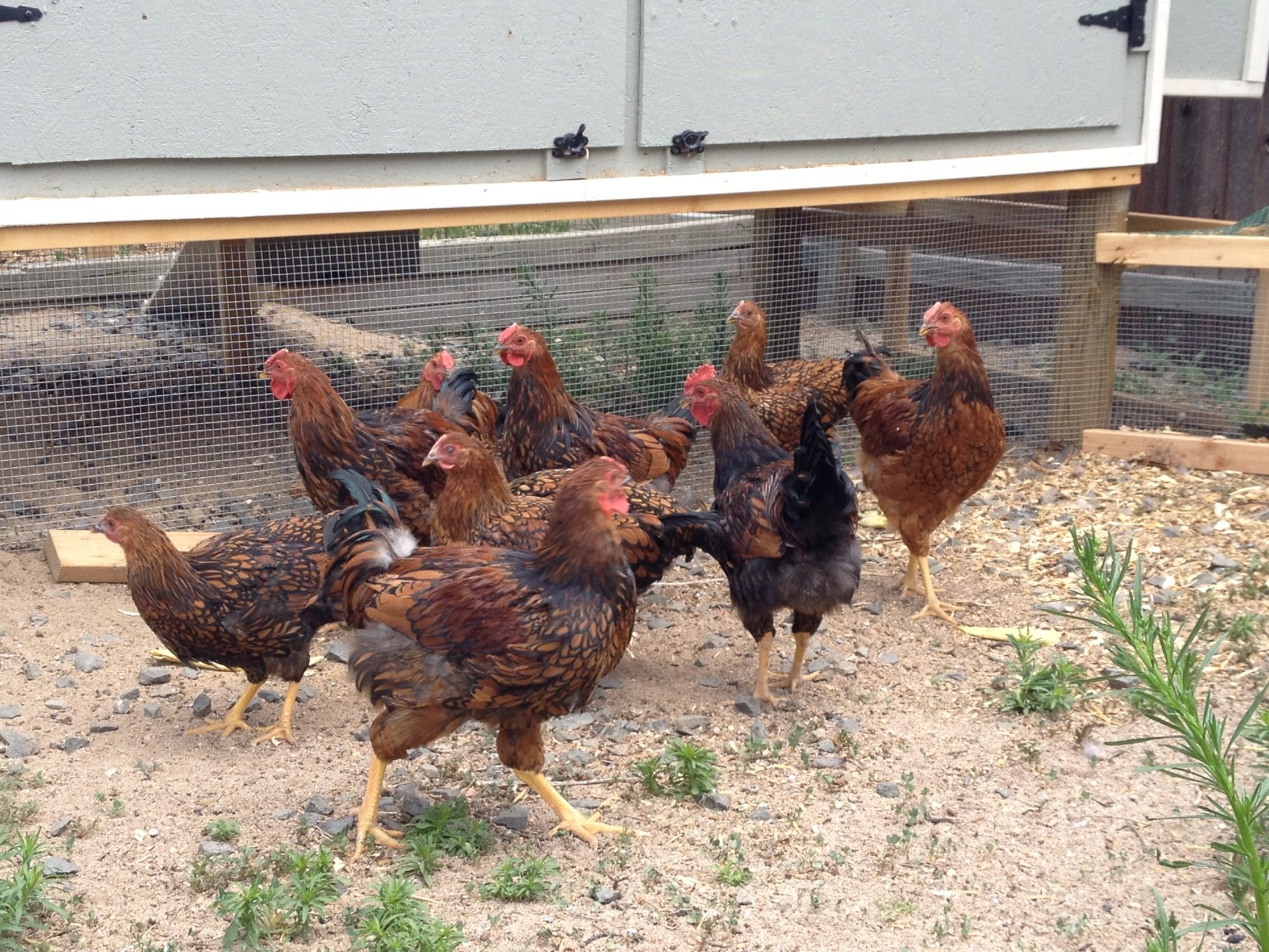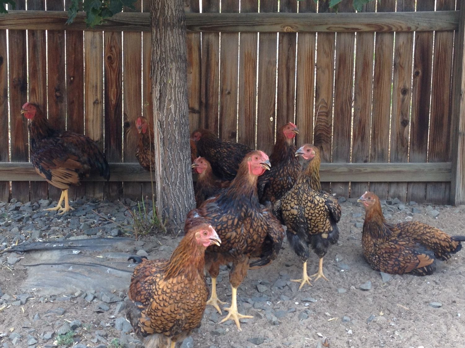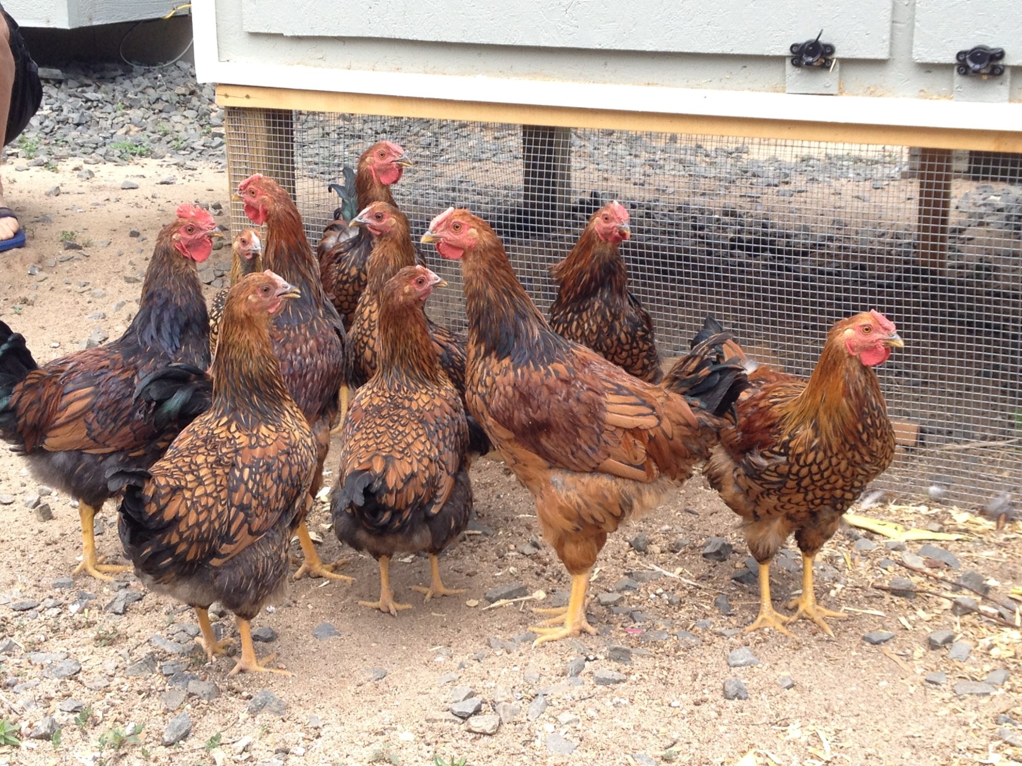 We got 10 chickens about 16 weeks ago and need to get rid of any roosters per city ordinance. We are pretty sure that the one in the far left of the second picture a rooster as he has been the loudest but most of the others seem questionable. Any help would be greatly appreciated!