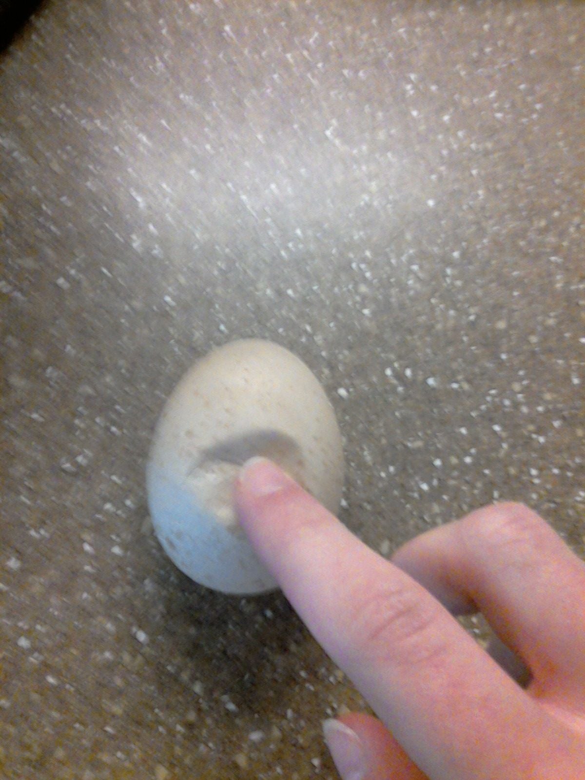 This morning I noticed beige color diarrhea from my year old duck. The shell of the egg she layed this morning, you can press on it and it just bends inward but does not break. This morning I noticed she dug out a nest and layed her egg in it, there were feathers in the nest also, I figured she might of been laying on the egg and broke the egg (from just looking at the egg it looked like it had just a dent) but I picked it up and like I said, can press on the sides and it goes inward but does not break. Also the egg has an awful smell