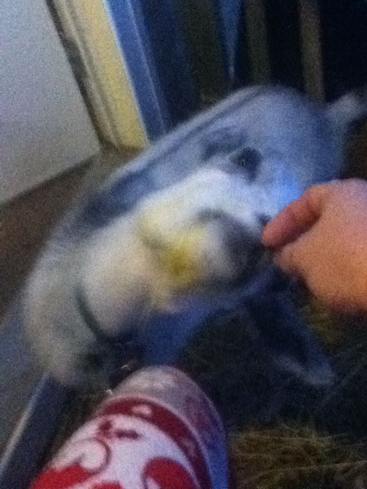 (Taken just now. This shows how her head stays to the left. And obviously she's noticeably thinner, although she's still eating very well. Sorry for the lousy quality..snappy iPod pics and after dark.)