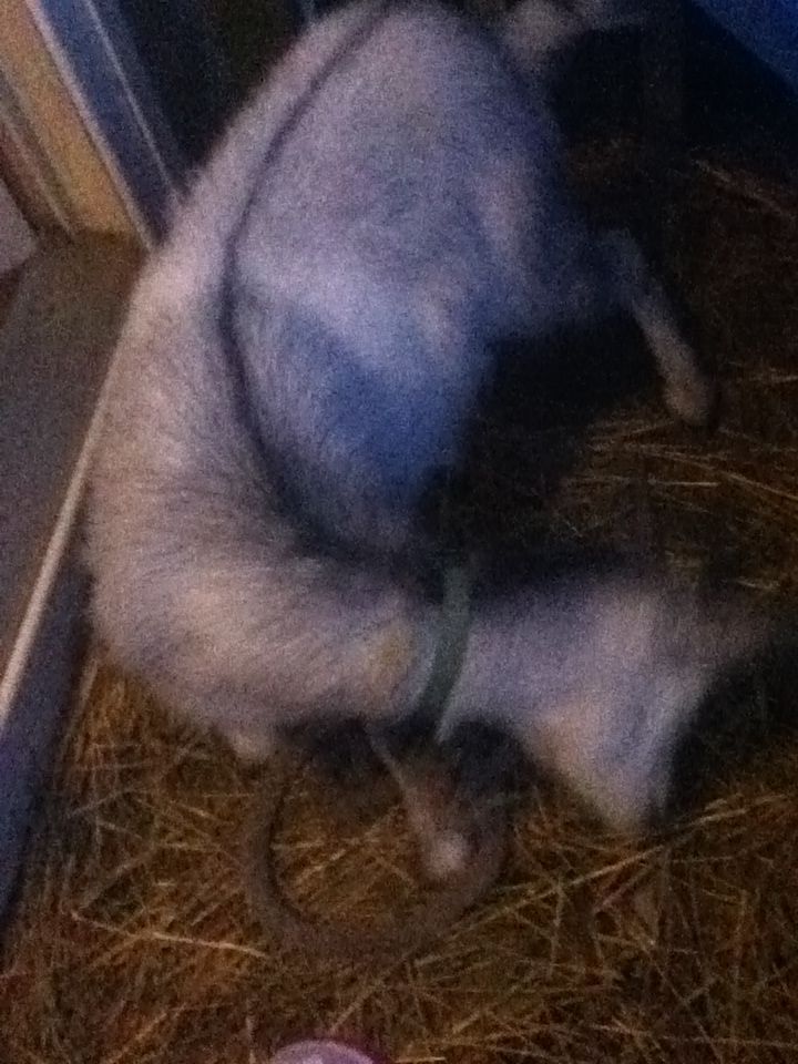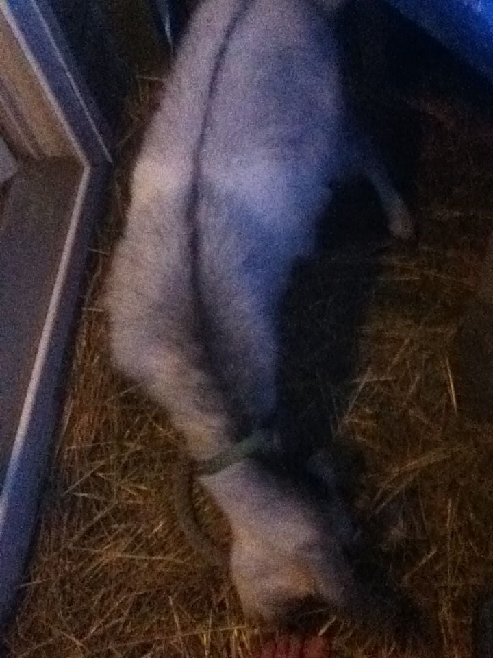 A few days ago, I noticed she was starting to act a little strange. She would hold one ear up and one ear down, all day. I thought maybe..an ear infection or something. Looked in and didn't see anything abnormal. The next day, she couldn't walk right and kept falling over, and the ear thing had progressed into holding her head towards her left side. I looked up the symptoms and the only things I could find that fit them all were Listeriosis and Goat Polio. Symptoms sounded almost identical and treatments were pretty identical..penicillin and Thiamine (vitamin b1). By that time of day, the local vets were closed. So we called around to all the Tractor Supplies and farm stores in a 1-hours-drive radius and found only one Tractor Supply that carried the thiamine, an hour away, so we rushed there and got it and the penicillin and rushed back. I found dosage instructions online, and we estimate her weight at around 50 lbs, so we started giving her the Penicillin, SQ, 3ccs, every 6 hours, and the Thiamine, IM, 2.25ccs, also every 6 hours. We did that for a couple days and that brings us to today. The Penicillin would make her weak and loopy every time we injected it, so I'm kind of afraid to keep that up. Today I started giving her the Thiamine orally, because the 18 gauge needle was really hurting her and she was starting to look like a pincushion. The directions I read said orally after a few days was fine. Anyways, I've seen no improvement yet, though I understand it could take weeks. However, she's developed a new symptom. If you read the "About" paragraph above, I mentioned last night. About midnight, I heard a commotion on the porch, so I ran out and she was on her side, flailing. She had her head stuck through the wooden posts on the porch, so I helped free her head, but she kept flailing. It slowed down to where just her head would try to jerk to the left/back every few seconds. Her eyes were jumping all over the place. I thought that was the end for her, so I ran and got DH to say our last goodbyes. We sat out there with her while she did that for about an hour. Then I decided if she was going to die, she was going to die happy, so we brought her in. Well, you can read about that above. She did the head jerking thing all night, until about 5am when I woke up to her standing up over me. I was so incredibly relieved. I should mention, we would have rushed her to the emergency vet right away if we'd had the money. In an unfortunate coincidence, our old dog started having seizures the night before and we had to rush him to the emergency vet. They didn't expect him to make it, but he pulled through, but left us with a $400 bill that wiped out the last of our Care Credit, and bills this month left us with no spare change, so sadly we can't afford to get her to a vet. Again, anyways, today she acts fairly ok..still weak, tired, a shadow of her former self, but another new symptom. I guess it's the same thing that happened last night, but not as bad. About once every 30-60 minutes, she'll fall over and start rolling/flailing. It doesn't really look like a seizure (but what do I know?), in that she doesn't shake, just rolls, trying to right herself. It lasts just a minute or two and passes. She'll stand back up and lean against something for a minute to steady herself and then be ok again. After she's steadied herself, so far, she's always urinated right away, but perhaps that's from freaking herself out..