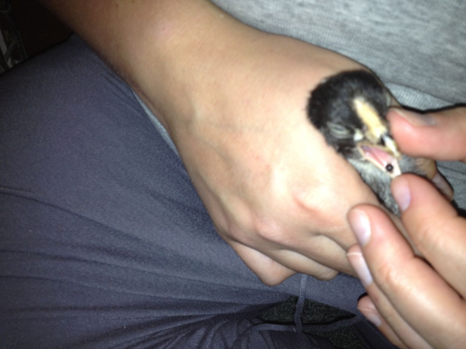 I have a 2 week old Dominique chick, and I just noticed her running around the brooder like she had something and the two other babies wanted it. I saw she was having trouble eating whatever it was. So I scooped her up to see what she had, and I found something stuck to the end of her tounge. I have no idea what it is. I thought at first it was a tick...but it's not. It's round, hard, and black. I've tried pulling it off, but I can't, and I don't want to pull her tounge out! What do I do?????
