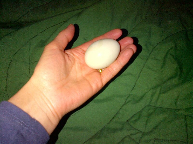 UPDATE: The poor darling (who is quietly living in a large dog crate with a 2x4 roost installed) has finally put back some weight, grown back her feathers (she had been in an encounter with some sort of creature and lost some feathers the date we nabbed her) and January 12th she laid this lovely tiny perfect blue-green egg. It weighed 42grams (second egg Jan 13th was 41grams).