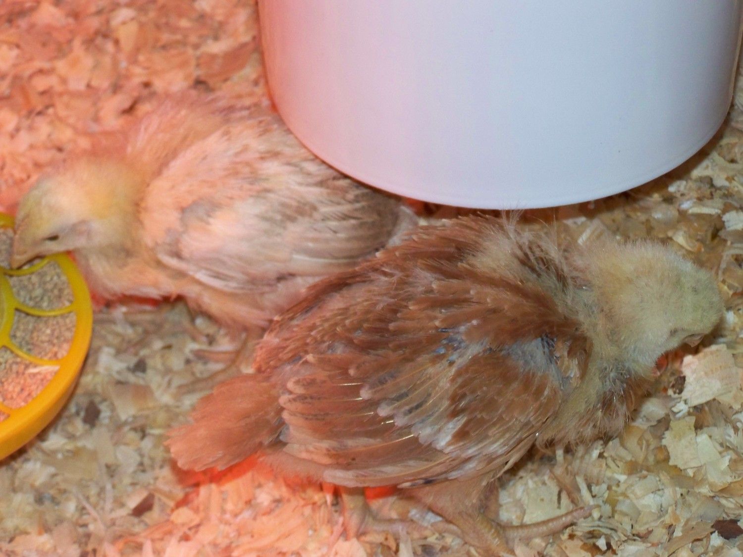 Mystery girl eating, RR pecking around shavings...