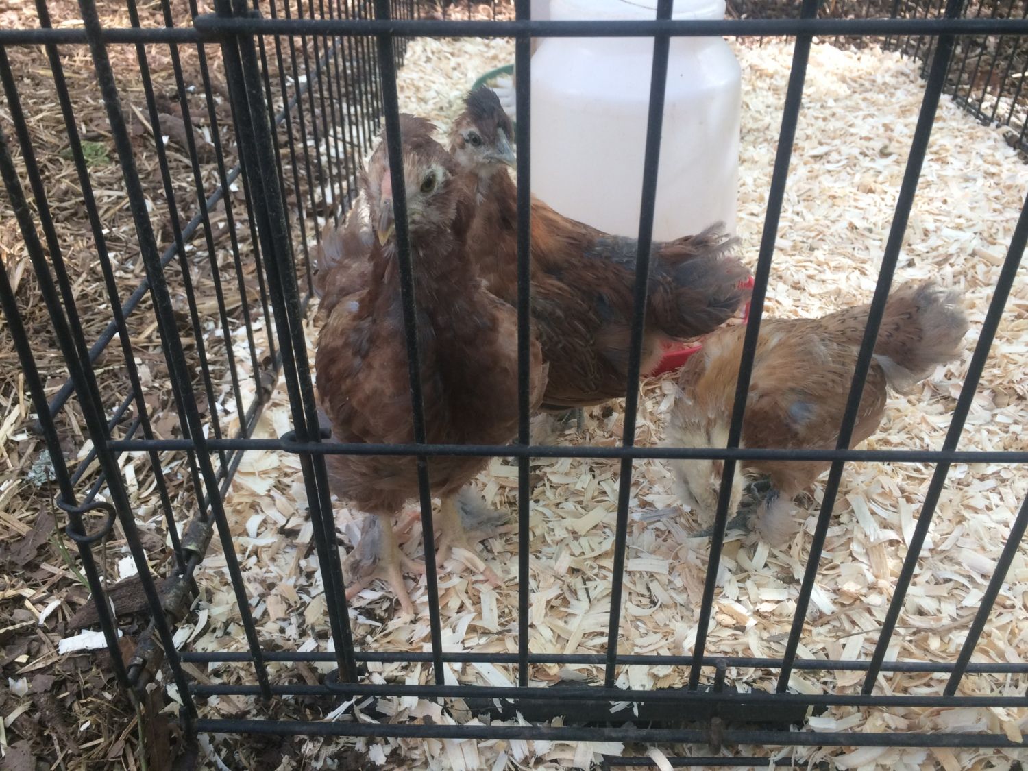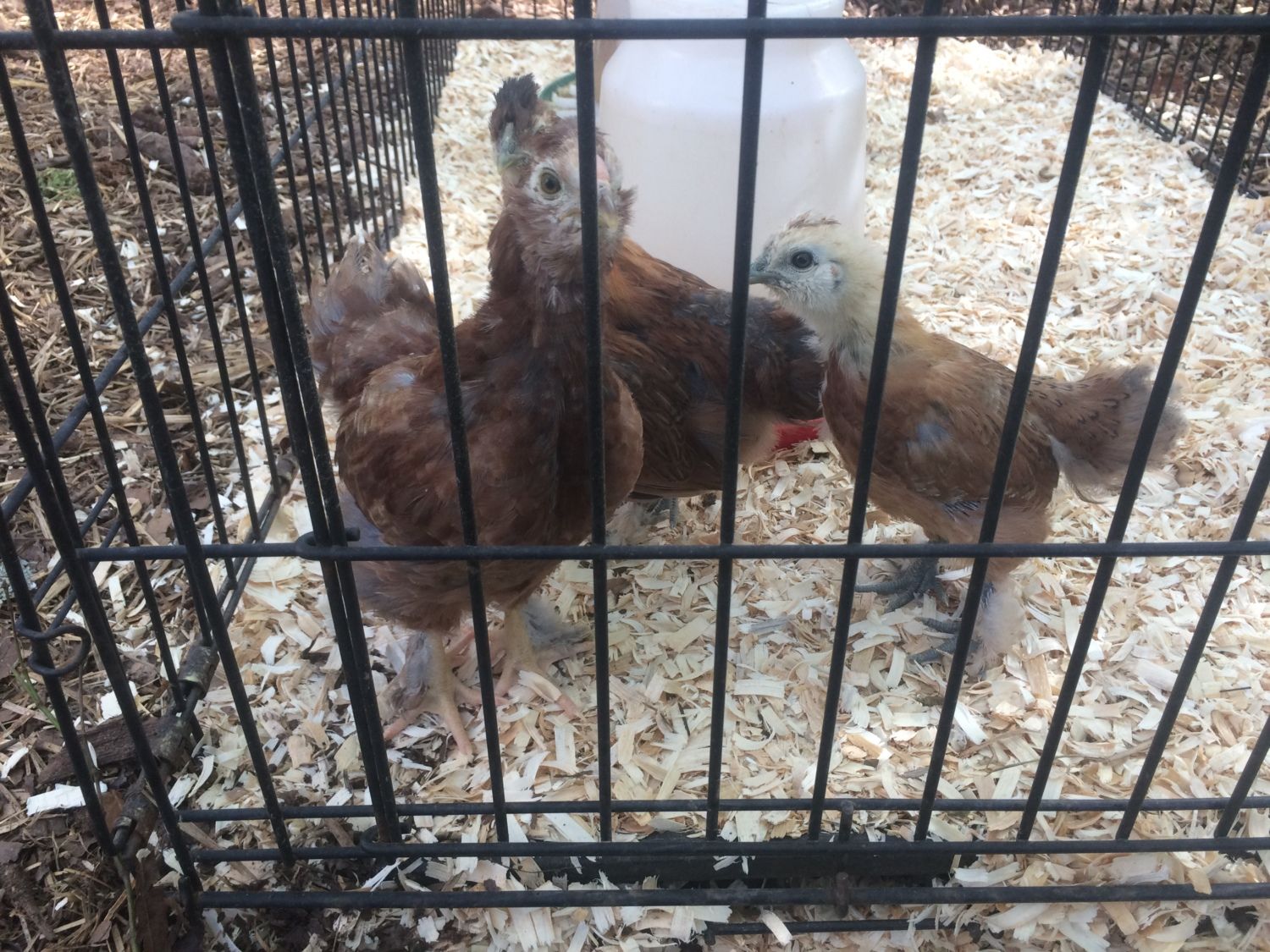 my silkie hen hatched three chicks a few weeks ago. i have a silkie rooster and some rir hens in the same flock. i think the silkie incubated a few rir eggs as well as her own. I'm wondering if anyone can help me to try to identify the breed of the chicks. i have attached the best pictures i have so far. they are about 5 weeks old