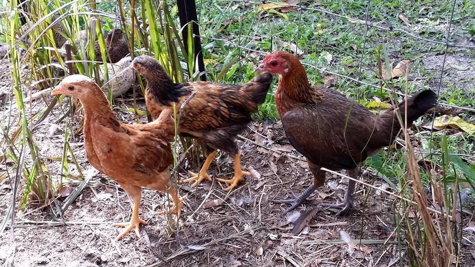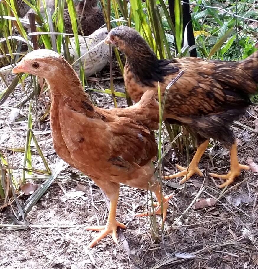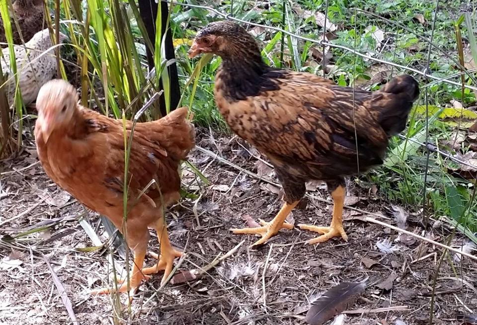 Help please! I have these two pullets, mother was silkie cross (5 toes, feathered legs) but she looked like a really small brown. father was who knows what.. just wondering if you could help me ID what these might be? Im in australia. The black chook in some of the photos is a modern game bantam. These ladies are 40cm to the top of the head and are 14 weeks old (the photos are a mix of 10wks and now