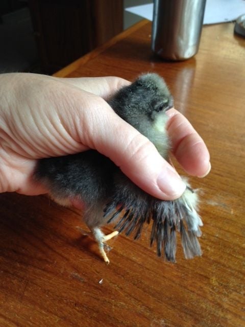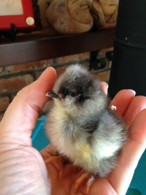 This chick hatched from a small whitish egg 6 days ago. First pic is at day one, the two on the table are from today (day 6). She seems to be a bantam with a bit of a top knot and feathered legs. I bought the eggs from a seller on eBay who said in her ad: