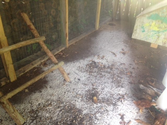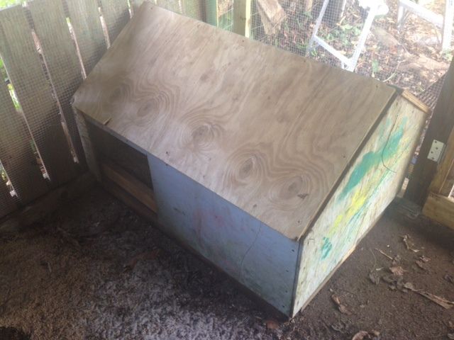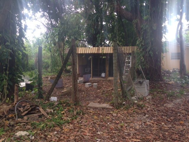 Its a 7' x 14' concrete slab with a roof. The four sides are one full wall with ~ 1/2 spacing between boards. a half wall with 1/2 spacing between boards, one open side w/ people door, and the back side is also open, but there is a full height wood pile that is almost like a wall. Its entirely enclosed with hardware cloth. Inside is a 2-step roost made from branches, and a doghouse filled with shavings.