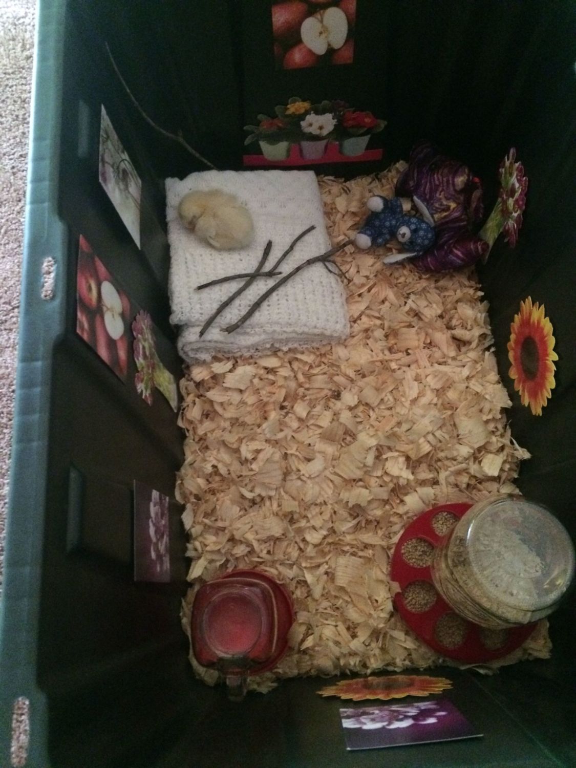 I have found a chick wondering alone and decided to take the baby in. It's been almost a week now and he or she is my first encounter with a chick. I have been reading all that I can on them and am trying the best I know to provide for the baby! I have bought a brooder box it's a large tote and have put down pine shavings purchased from tractor supply. Bought a feeder with chick starter and a waterer also. I've made a few little "homey" touches to try and keep my baby entertained which include a hanging cd (so baby can look into) a perching ladder made of sticks, toilet paper roll, a rock baby can jump on, tiny stuffed animal and 1 small blanket that I have noticed baby likes to sleep on. Also have a heating lamp to keep baby warm. I'm just looking for advice to keep going with raising him/her and would appreciate any that is given! I live in a large apartment but take the chick out every so often to graze and today chicky caught its first ants and loved them! Is there any signs of sadness I should look for? Am I doing a good job? Has anyone kept a chick indoors and had success? Please let me know thank you. Chick is about 3-4 weeks old now. Thank you!