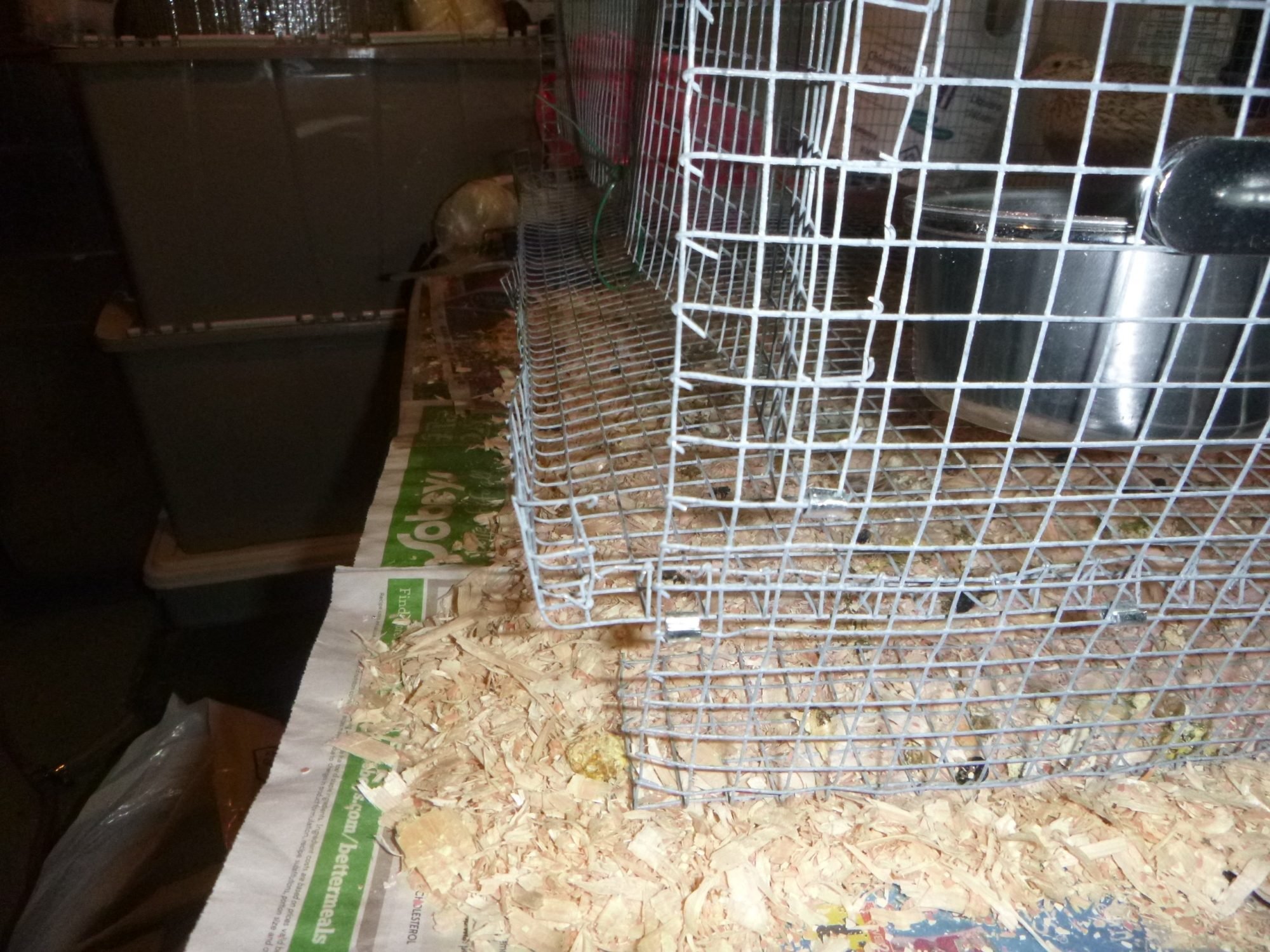 My cages are similar to Em's but are 48" long with a door on the front and a thin plywood divider with a cutout to provide a hiding place. I used some cutouts from a plastic tote lid to provide solid flooring in the hiding area.