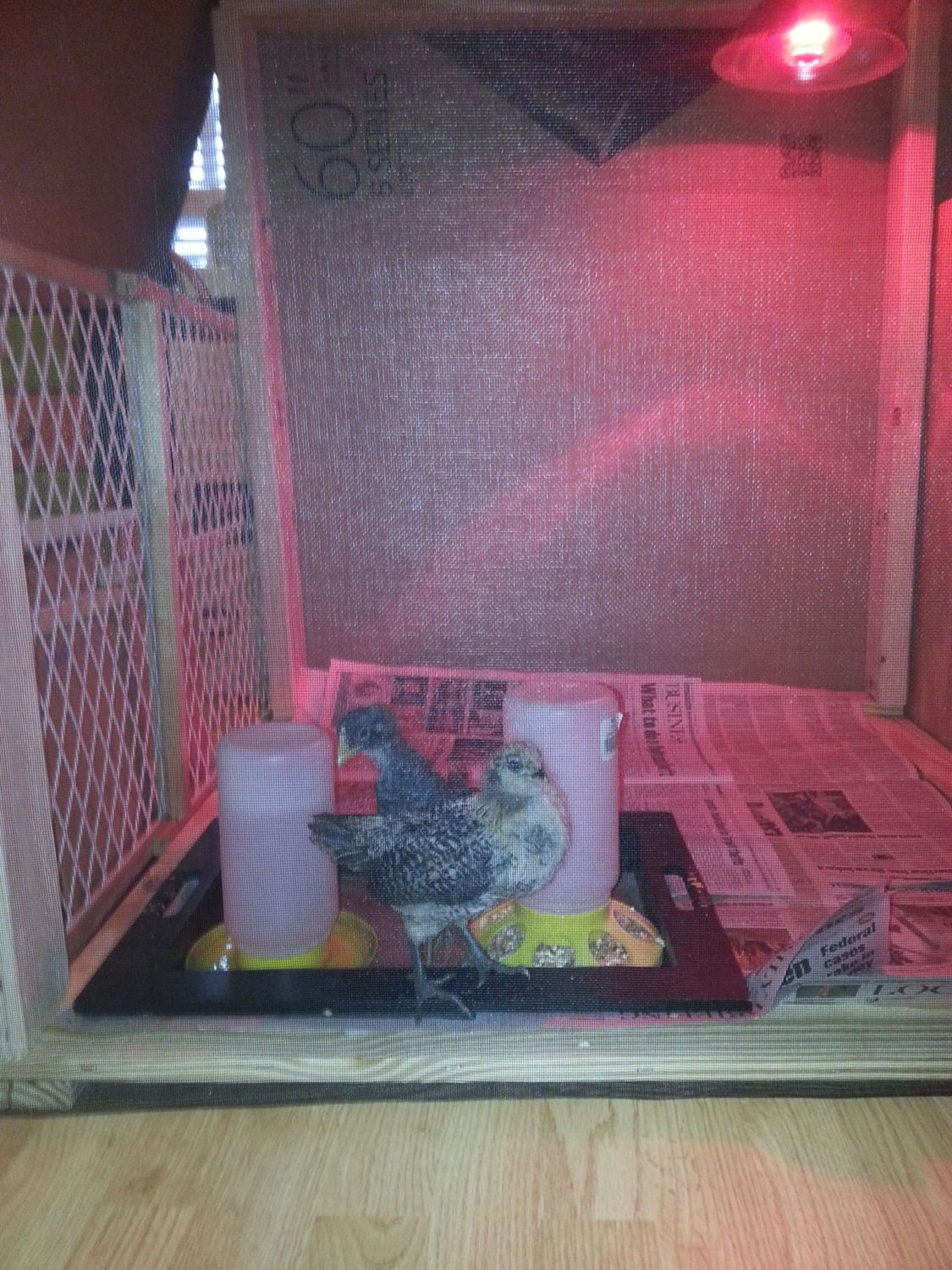 Oh MY!! I think we messed up here then.. big-time!!?? Our roost is enclosed with NO door in THAT section of all things!! Don't know WHAT we were thinking!! I thought you just put straw or something there and just pull out and change everyday.. I wasn't thinking that poop was going to go thru that into the wood underneath it!! Let me understand clearly here PLEASE.. in the roost, basically their sleep house.. you should only put a stick across for them to stand on and is THAT how/where they sleep?? I thought they would sleep nestled down ON the straw?? They don't?? So then why are other's saying to put straw in the roost and in the nest?? Ooooh I'm feeling SO dumb right now!! I'm just SO confused and amazed at how little I know about all of this!! I am thinking that my husband is going to have to alter his design by putting a door in the roost. That's the ONLY area that we did NOT put a door in!! There's only a small window there on THAT section!! WOW.. we messed up!! Guess because they both lay nestled up together on the floor NOW, I assumed THAT was how they'd sleep in their roost?? But guess they only sleep this way NOW because they have NO stick inside in their little temporary coop my husband threw together for them and second because they're still young??!! They are now STILL inside.. in a spare bedroom that has wood flooring on it and my husband threw together a small coop with wood scraps and cardboard!! I'll put up a picture of it!! SO..in summary (and I apologize for my ignorance!) ALL they need in their roost is their stick going across side to side, with a piece of wood covered with linoleum or anything slippery that's easy to clean that slides in and out easily UNDER their stick?? NO straw.. as they will sleep ON the stick?? THANK YOU SO MUCH for all your help in "learning" me about chicken "rearing"!!!!!!