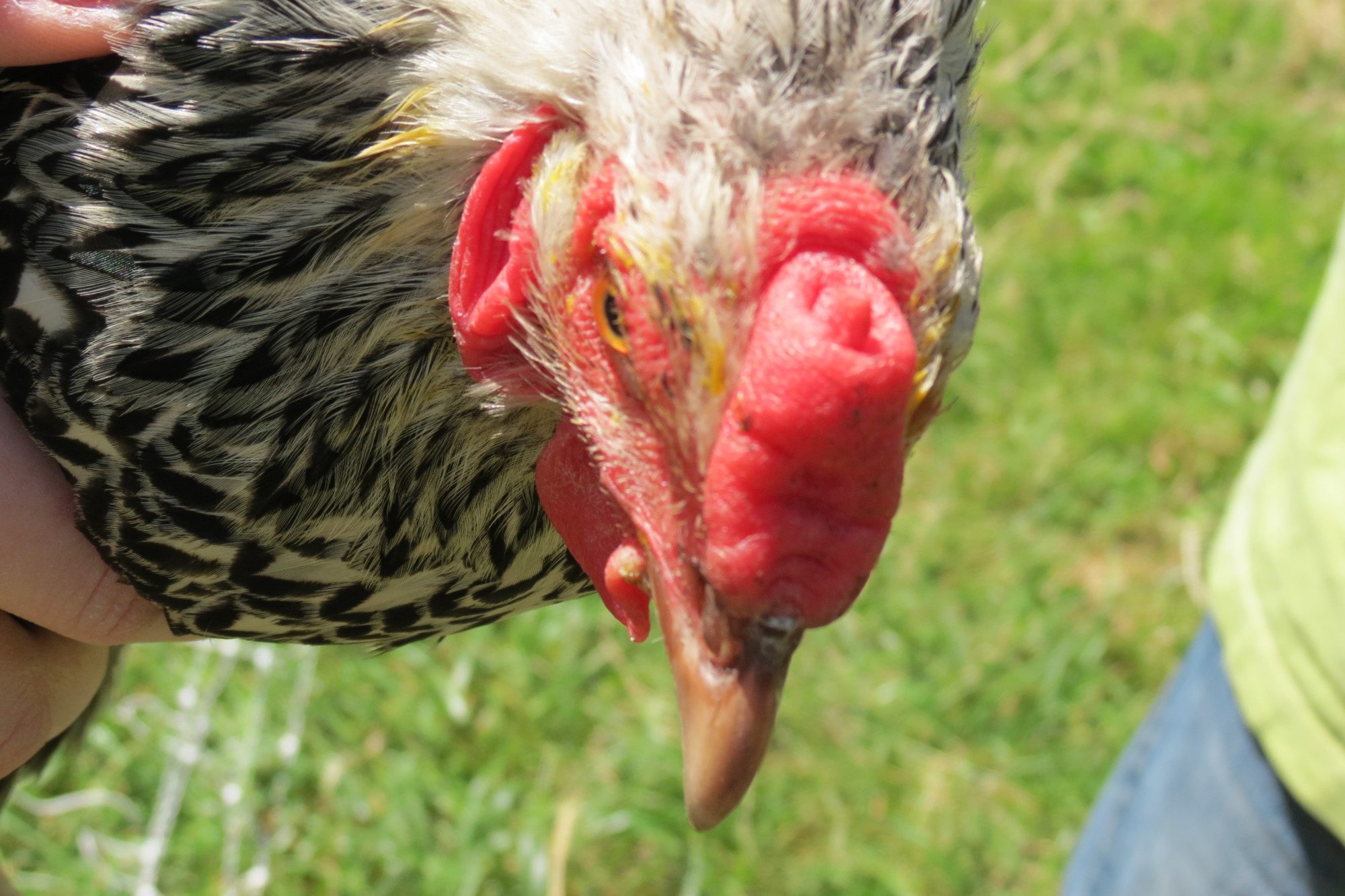 We have mature hens, all approximately 1 yr old. Several of the hens appeared today with this condition. There is some yellow discharge around their comb, and it is oozing down their feathers. See attached photos. Has anyone seen this before? They appear to be behaving normally. Thank you for looking!