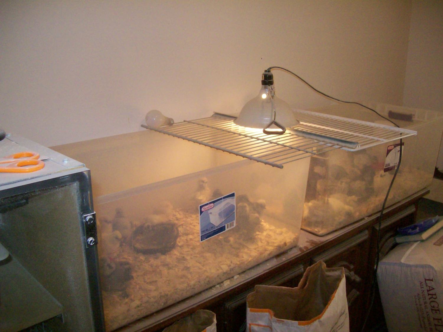 I raise my chicks indoors at first in plastic tubs. I use the longest ones I can find. That way the chicks have plenty of room and can move away from the heat when needed. I like the ones they sell at xmas time for tree storage. I collect old refrigerator racks and oven racks to use over my tubs to set the heat lamp on over the chicks. I never use a heat lamp bulb. Too hot. I start newly hatched with a 75 watt bulb for a day or two. Then go down to 60 watt, then 40 watt. You need to watch your chicks to know when to lower the wattage. Too cold, they huddle under the lamp. Not much moving around. Too hot, they will get as far away from the heat as possible. When comfortable, they will be running around, making happy chick sounds, eating, drinking, etc.