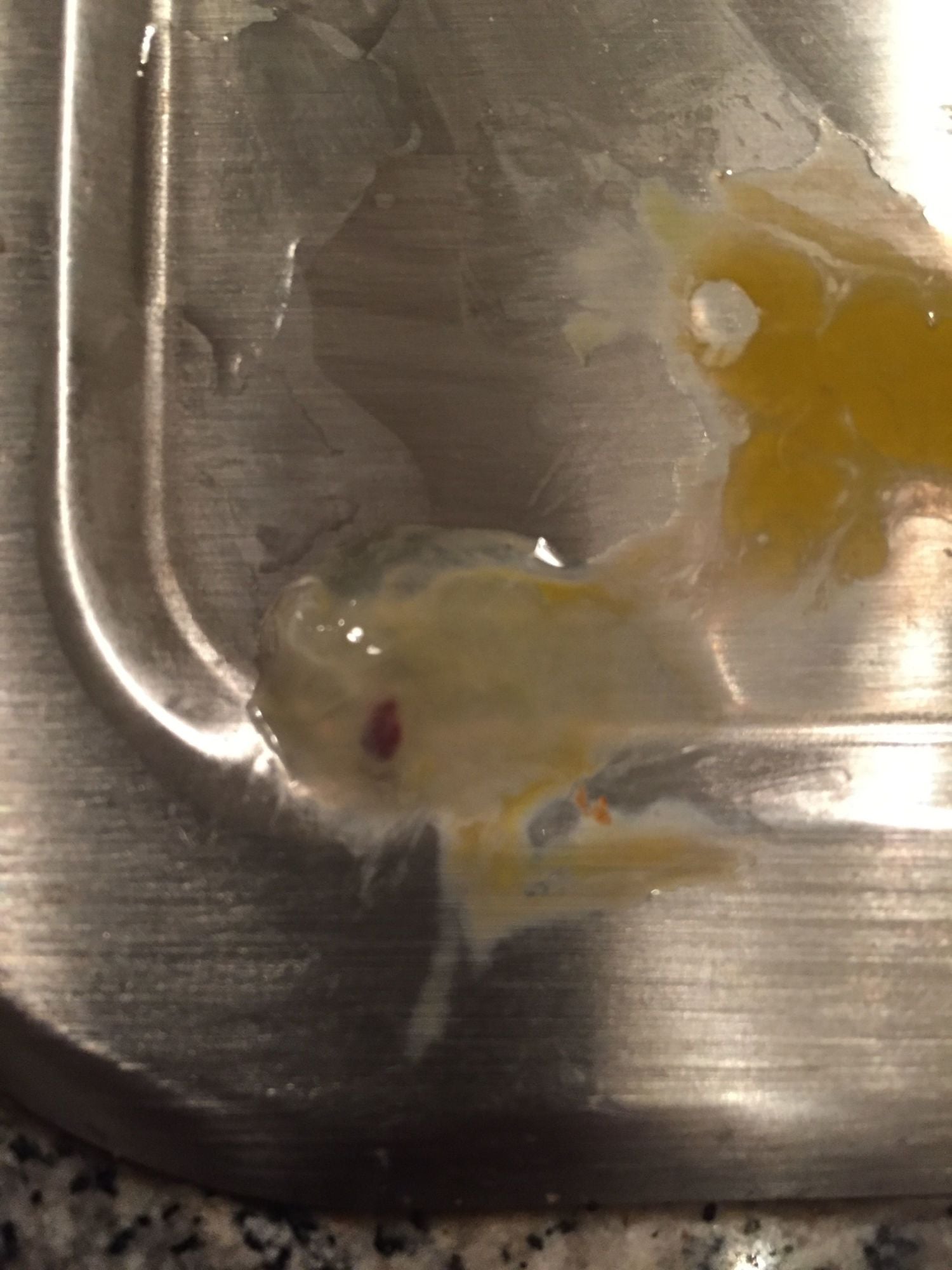 How old is your hen? We often get red spots in eggs from older hens, but my first thought was that the egg was fertilized. If she's just older, the red spots don't hurt anything and are just visually unappealing. We scoop them out with a spoon.