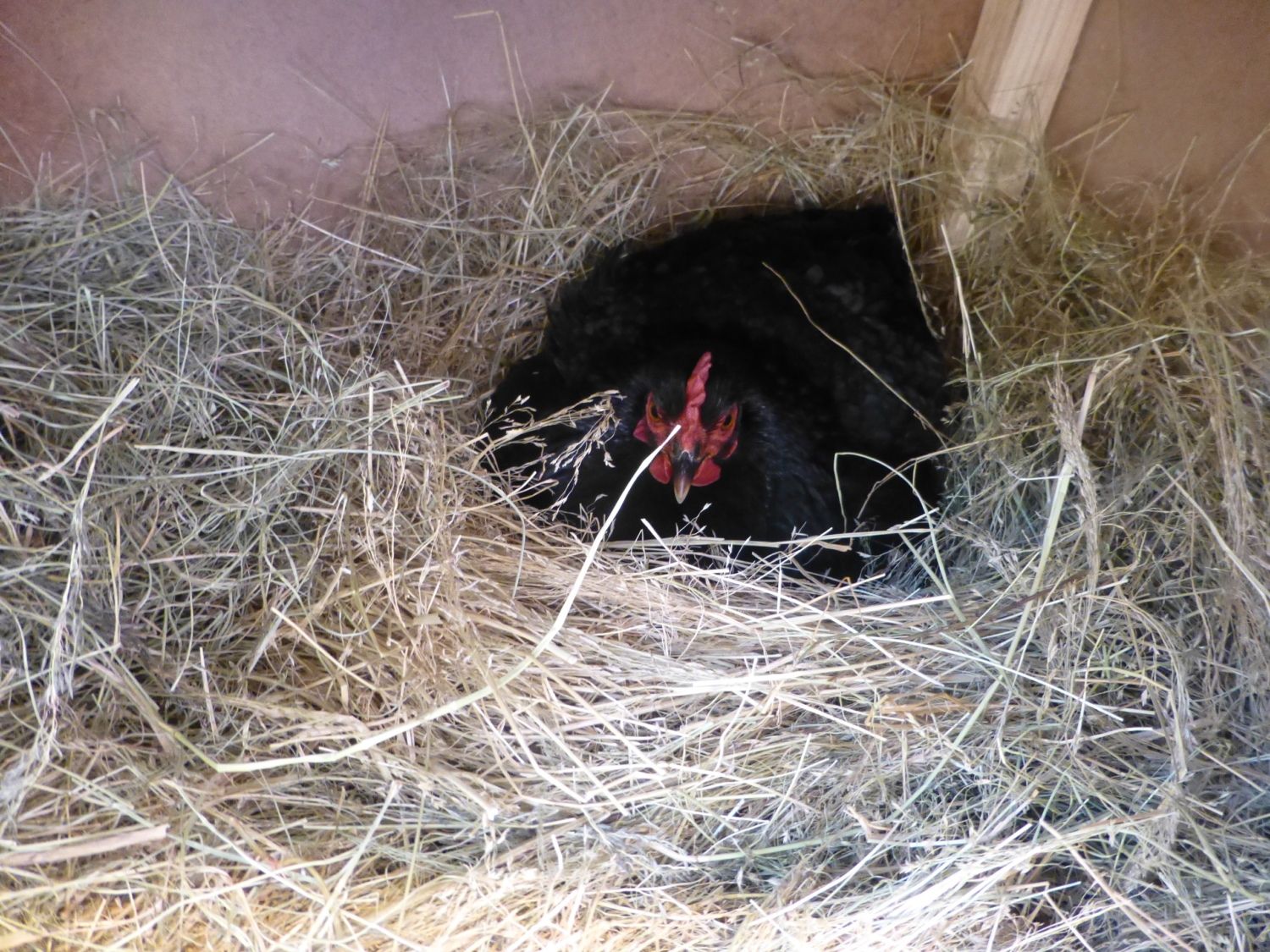 Molly has been sitting on her one egg for, it seems ages, I have lost all the info when she first laid but am sure it was weeks ago. How long is too long? i am worried beause it so cold and have put a heat light in their house, but with the power cuts it keeps going off. I felt the egg much to her disdain, it feels warm and it seems like she hasn't moved. Put food outside the nesting box and water but not sure if she is eating or it is the others?