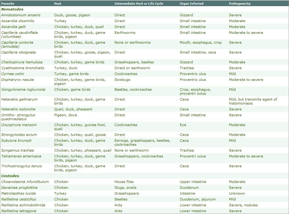Albendazole has been reported to be effective in the treatment of capillaria, ascaridia, heterakis, and