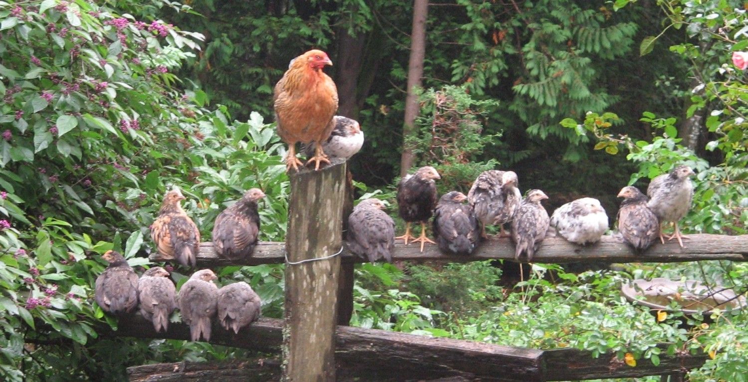 Mother Hen (a cross) and 15 of her 16 chicks. She had a nest hidden in the bush and one day she walked out with 16 bumblebee sized chicks in tow. She was sitting on 18 eggs.