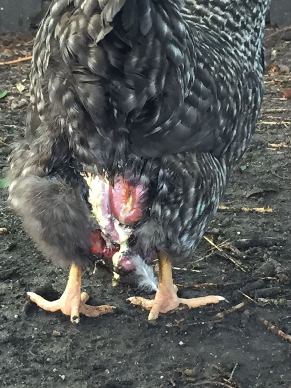 Help! I found my hen with her back end insides hanging out this morning. Could abother chicken or duck have done this? What do I do??