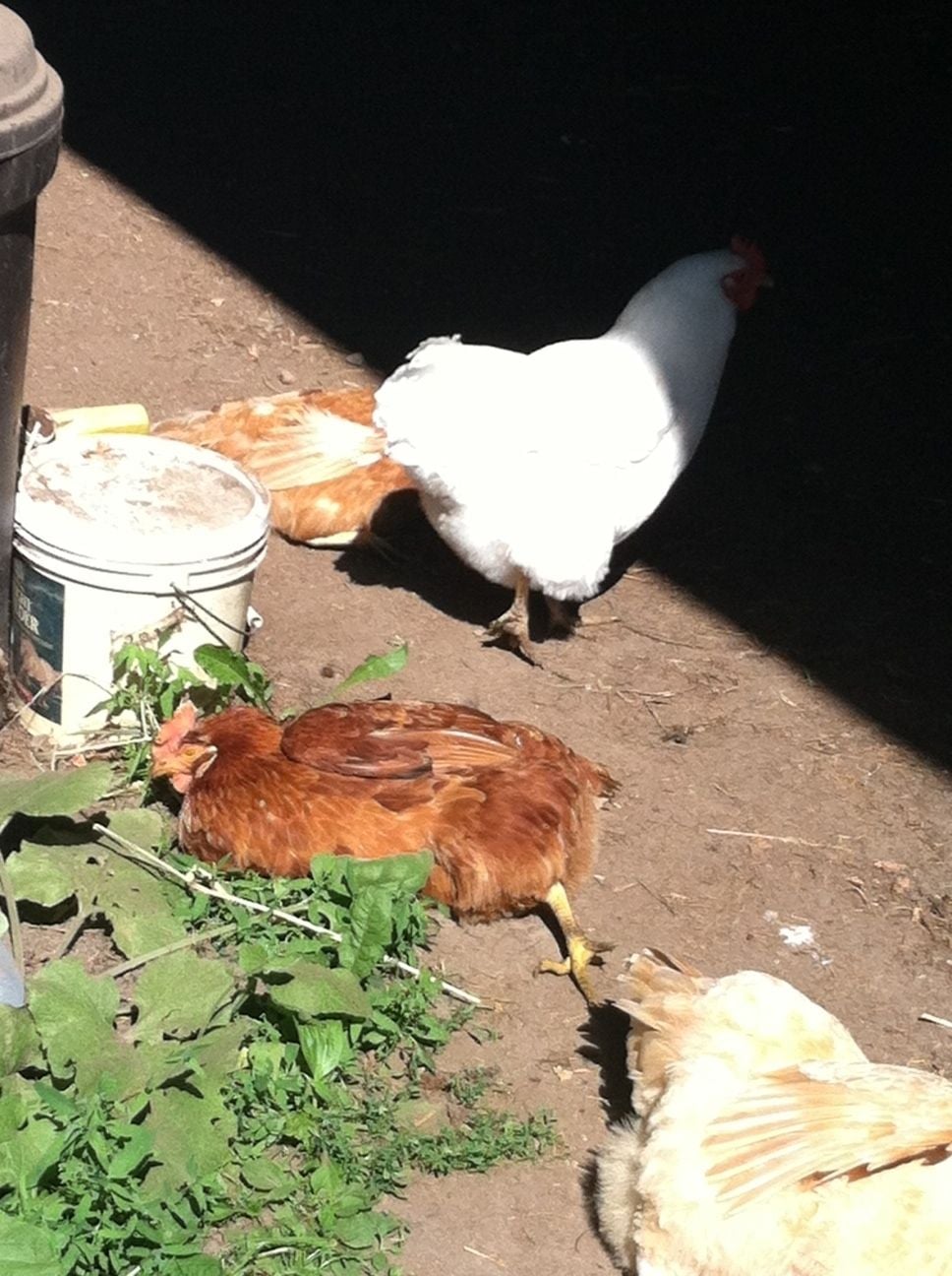 Any advice? I am especially worried about what to do with her over winter. I may need a chicken sweater. Here is a photo of her back in June or so. Her comb is paler and you can see the beginnings of her feather problem. She is the red one in the middle...this was in the middle of a hardcore sunbathing session for all the ladies.