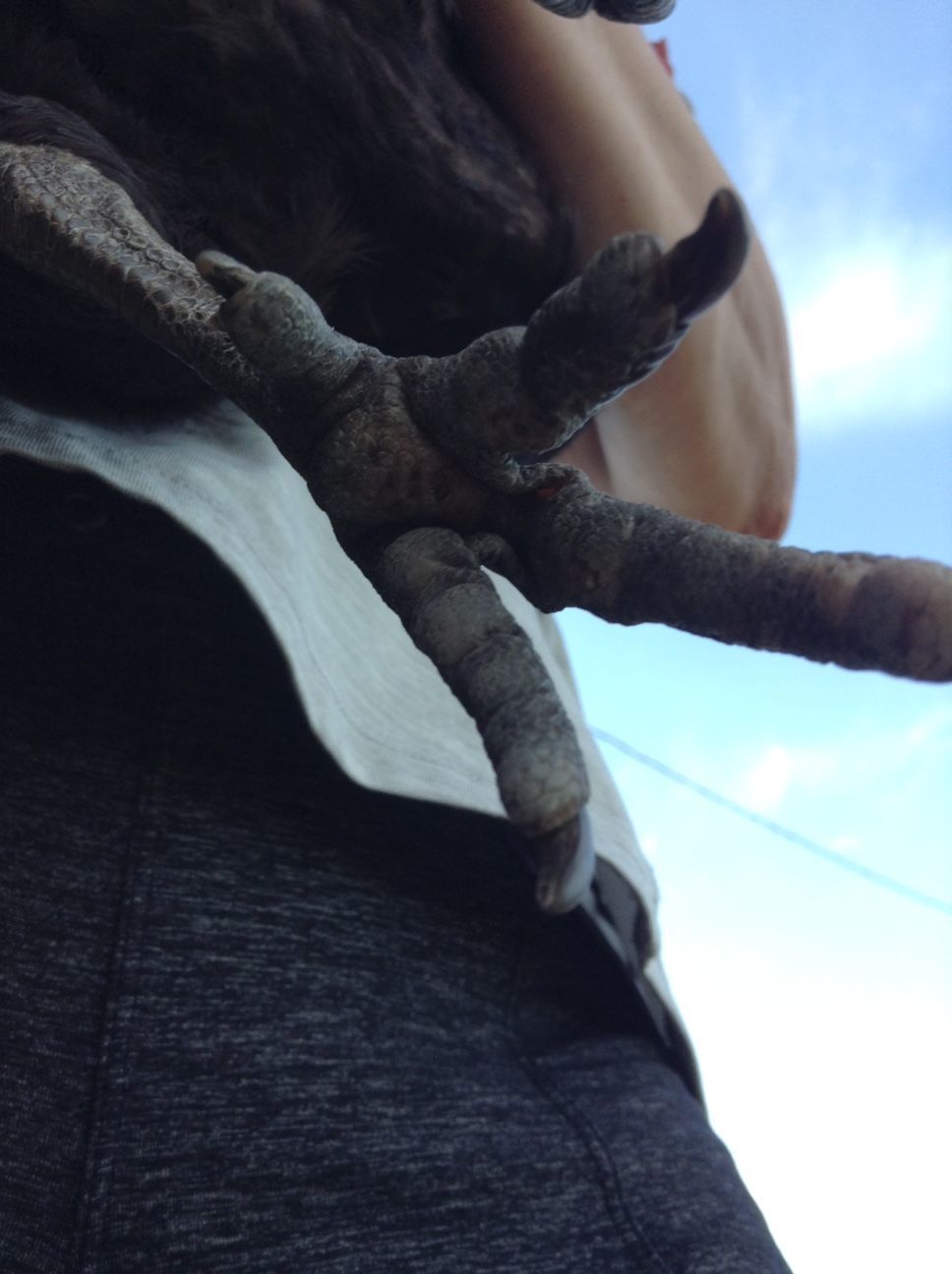 Having not seen BJ the Black Sex Link yesterday, I came home today to find that she was keeping weight off her left foot (behaving normally otherwise). Here are pictures of her feet and a video of her walking: