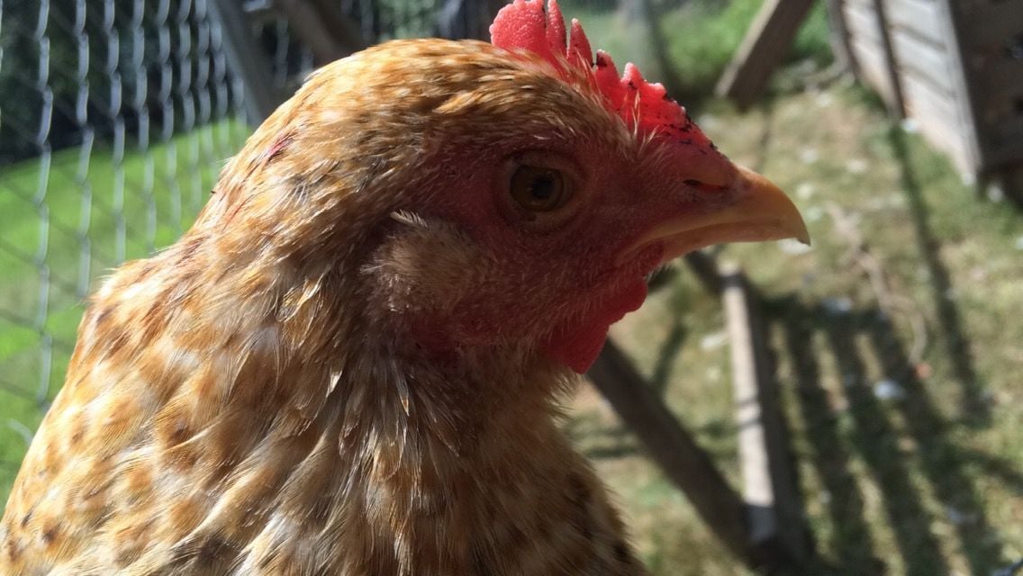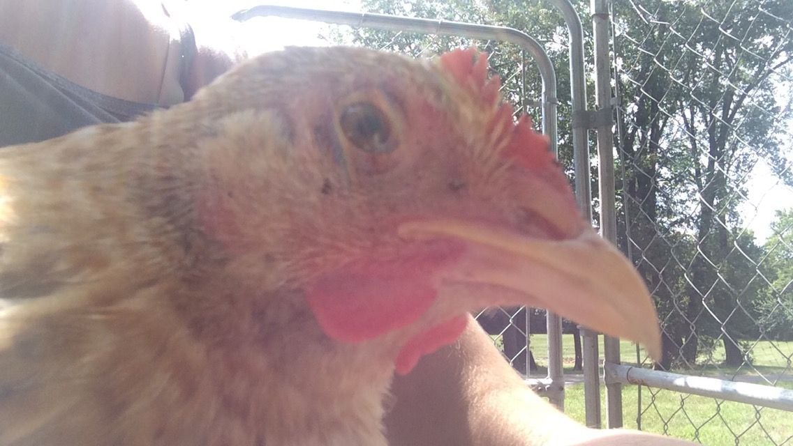 This photo is that night. The fat cells swelled after being exposed to air and made the wound look 10 times worse than it was. Unfortunatley the rest of the photos I have of the wound as it heals are on my phone (I can upload them into the comments). But anyways...that was just some background information. She is healing perfectly. After 3 days of the treatment the wound began to close so we treated for another day and then let it heal. It is now a quarter of the original size. She is living in my brooder box (3 foot by 3 foot) in my garage until she is healed completely. I leave the garage light on all day for her and turn it off at night. Sometimes the garage door is left open during the day but I am nervous about doing that because I lost two baby chicks to raccoons when the door was left open. A couple days after her injury we noticed her face and comb were very red and because she is close to laying age I didn't think much of it. Here is a pic of her face (side view) the day before her injury & one the day of her injury.
