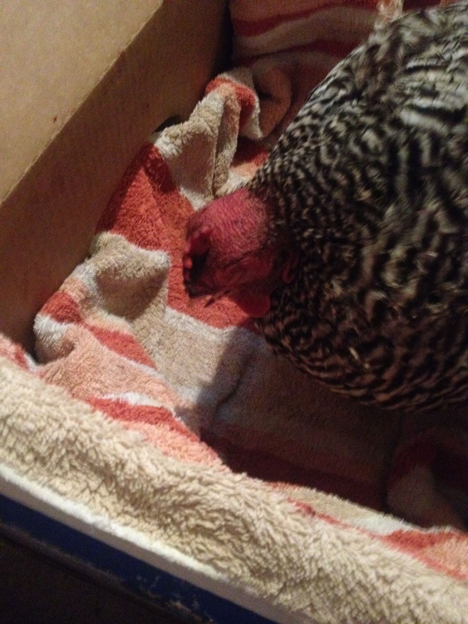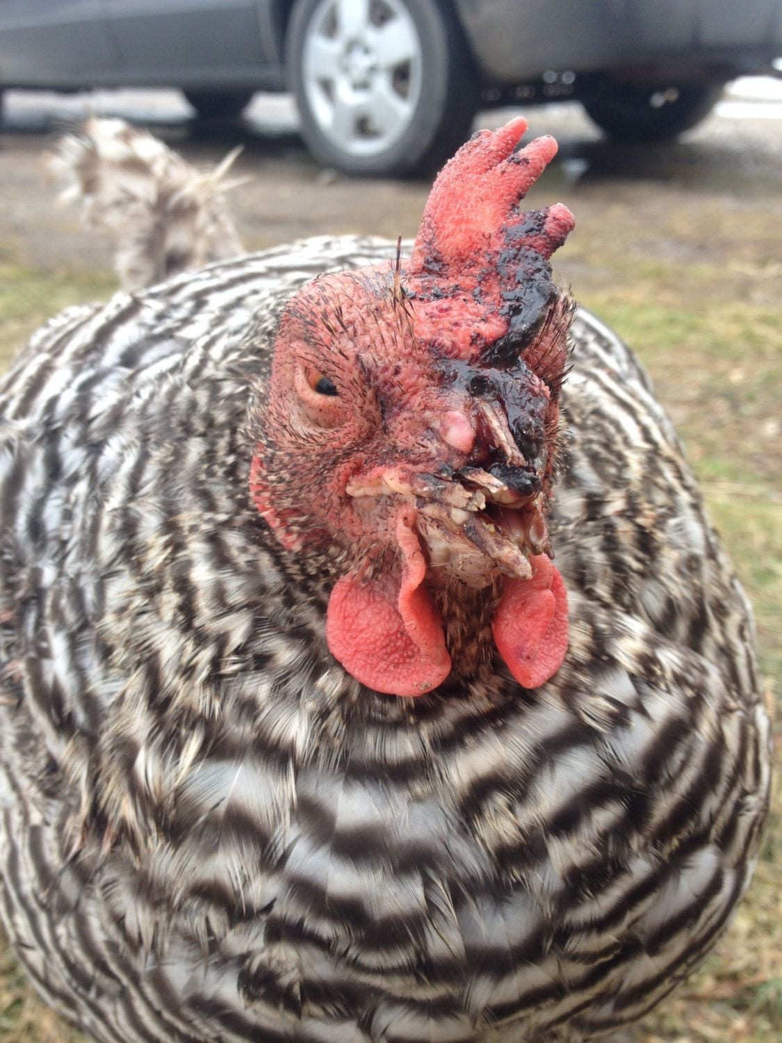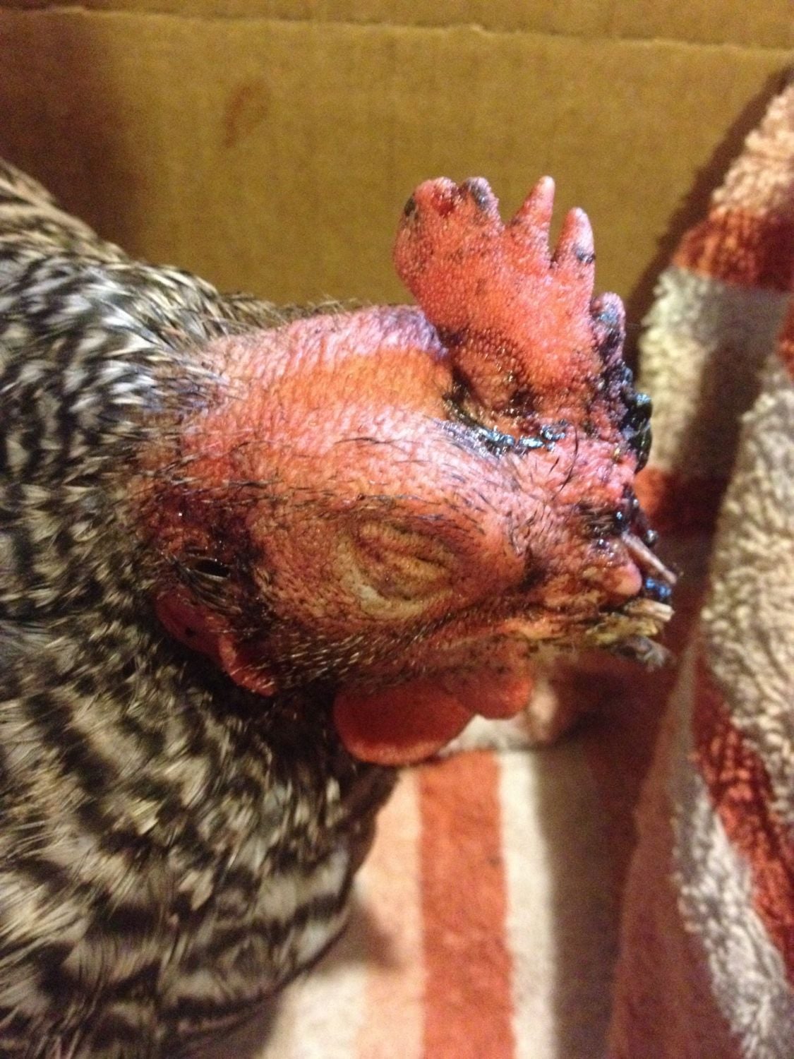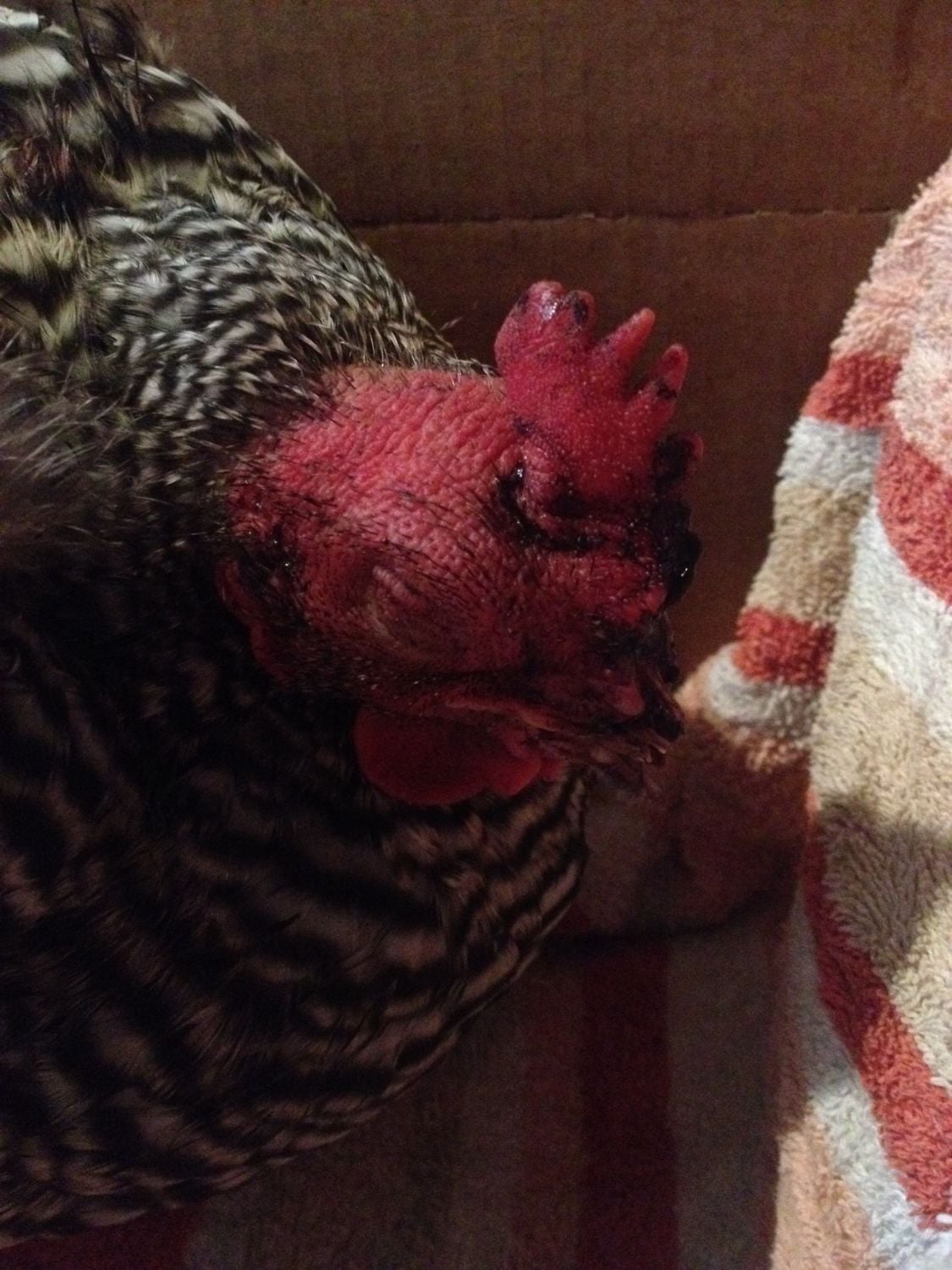 I am devastated. I got home from my grandparent and heard the chickens bawling very loud. I ran back to the pen and saw a chicken huddled in a corner. Her face had been so destroyed, I couldn't recognize who she was. I then discovered it was my sweet girl Fuzzy Bum. Fuzzy Bum is the toughest and fastest girl I know. She regularly flies out of the pen the eat the grass outside. She had been attacked in our bush, but she escaped and flew back in the pen. I looked for footprints and saw large dog footprints, leading to my neighbours house. My neighbour lets her large husky mix dog loose on a daily biases. This is the second chicken she has got. Since Fuzzy Bum is such a trooper, she made it through the night. She is very tired and cuddles her face into her back feathers. So, she was hurt pretty bad. Her beak is gone, her eyes are swollen shut and she has a small hole where her ear used to be. The bleeding seems to have stopped, but her berthing is somewhat heavy(Sorry for the bad quality picture)