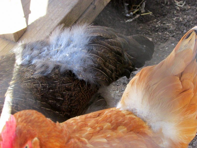 All of that is to say it is VERY hard to tell when your chickens have mites! The chick was the only proof that we had them - no signs anywhere else, except the missing feathers. They are missing just above the tail on the back, and now on the shoulders/wing area. I am pretty sure this is a result of the chickens pecking their own feathers due to the irritation from the bugs. I have seen them reach their heads around and scratch at the exposed area, and it's exactly where they can reach. We dusted them with Sevin and thought that should do the trick, but there was no improvement. One time is apparently not enough - the Sevin kills the live bugs, but I believe the insect eggs laid on the bird hatch and need another application. I would imagine it'll take 4-6 treatments to break that life cycle, but I need to research that more. We also cleaned out and dusted the coop with Sevin, but no help.