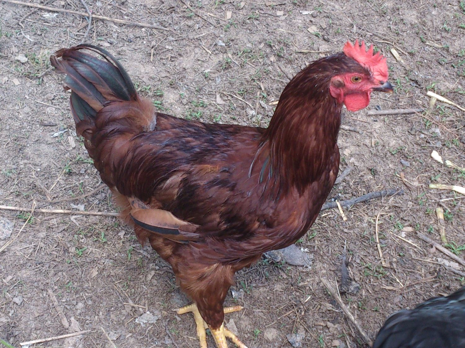 I have 12 hens, 6 (3 blk sex link and 3 red sex link ) that are around 16 weeks old, 5 (white leghorns) and 1 (RIR) that are around 11 weeks old. Yesterday I went onto my back porch and all the girls were standing at the gate of the chicken yard. All of the sudden, I heard a cock-a-doodle-doo over and over again! Um, hens aren't supposed to crow. I went to give them some veggies to eat and noticed one of them has a much redder face and dark green feathers on the tail that arch. Here is a pic of the one I suspect may be a rooster. I read that sometimes hens can take on the appearance and position of a rooster. Is this a hen or a rooster? I suspect it is the 11 week old RIR bc all the others are red or blk sex links and look completely different. It also has a few dark green feathers at the base of its neck. What are your thoughts??