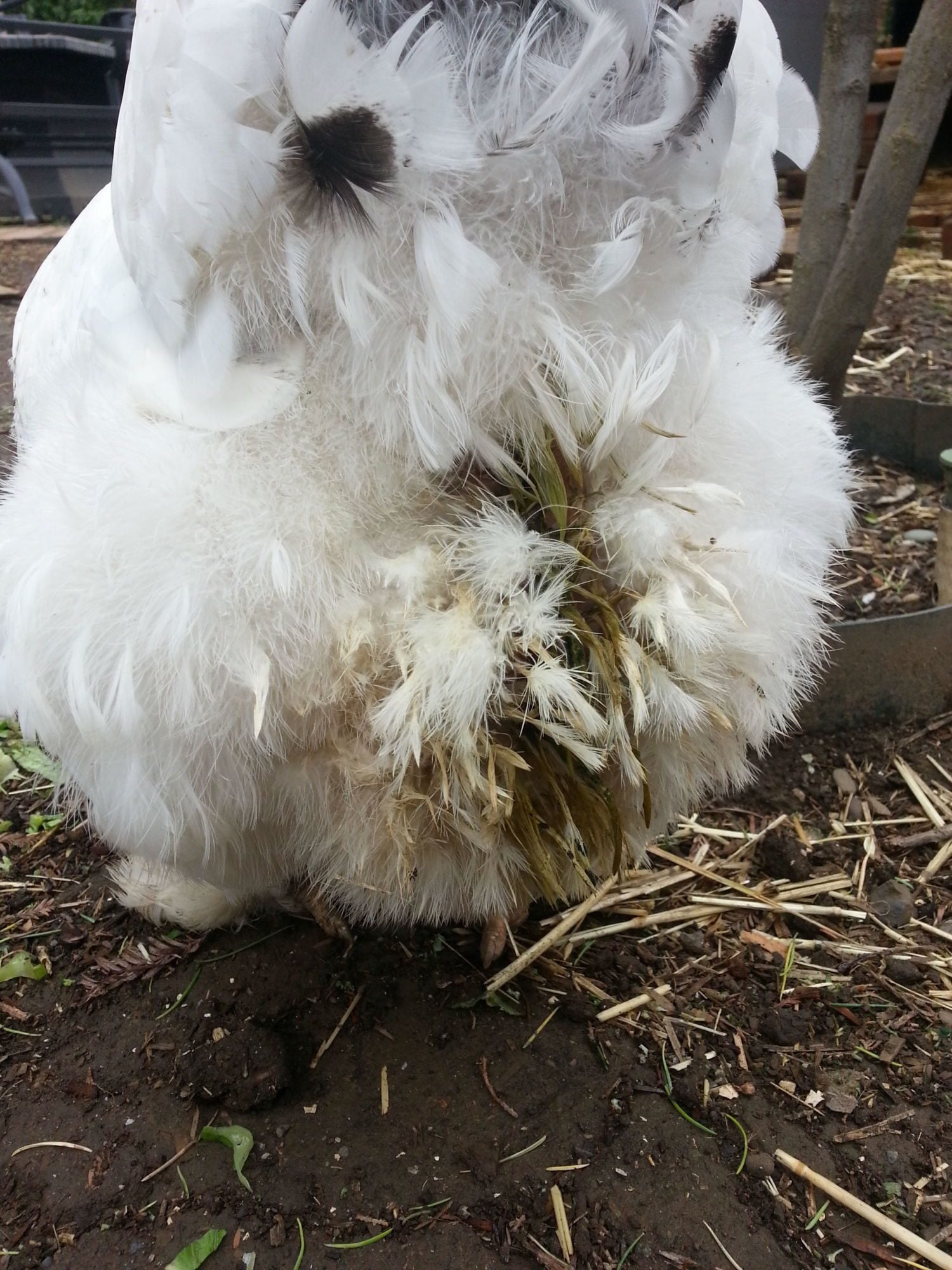 We have a three-year-old light Brahma hen, and she has been sick for about three days. She had this ailment once before last week, but she seemed like she was doing okay, and she started acting normally. But now all her symptoms have returned, and she isn't doing so well. She still eats and walks, but she poops a dark green and acidic looking poop. I will try to get some pictures of it when I'm able to. I did photograph the poop stains on her flufflebutt: