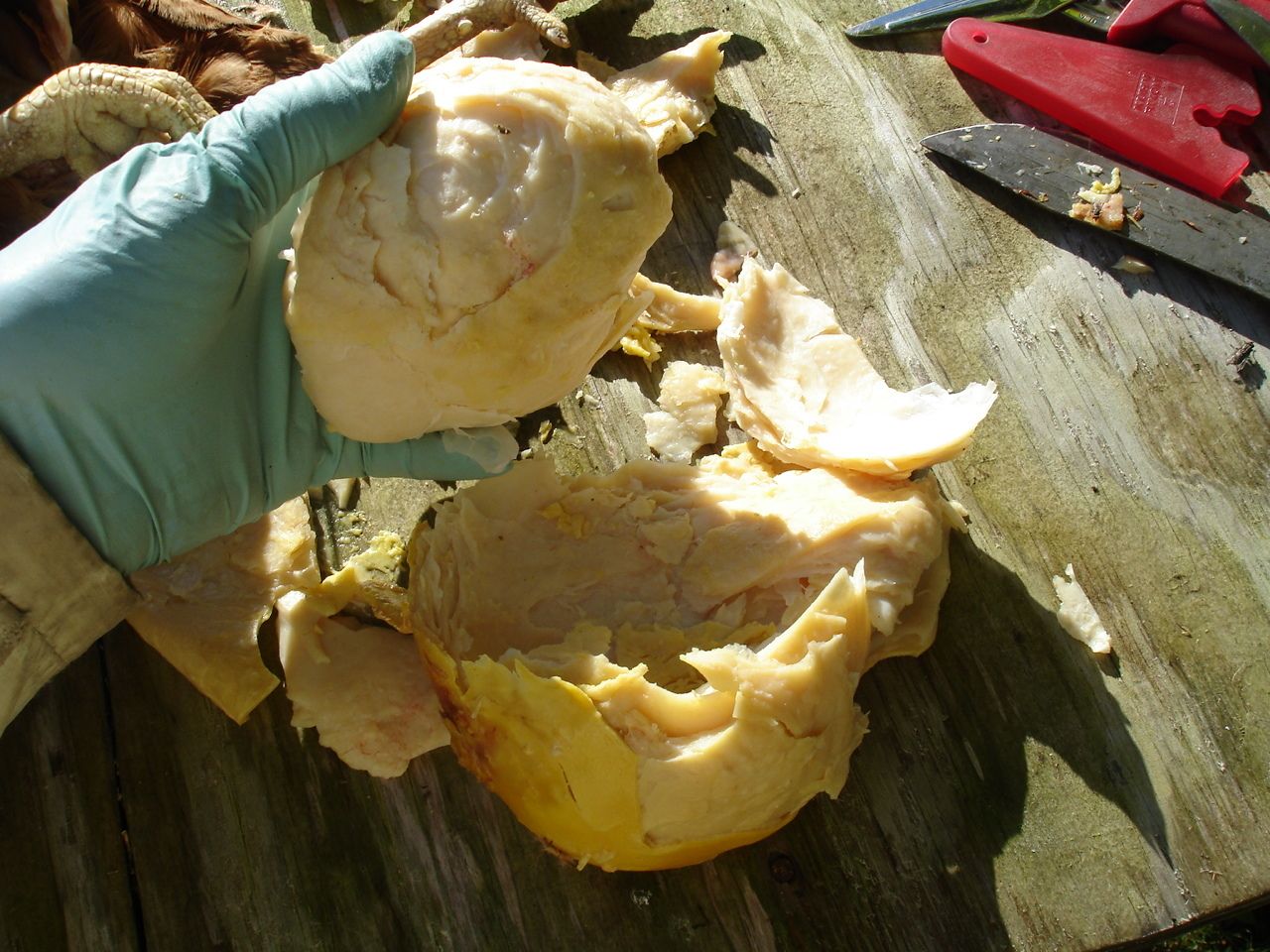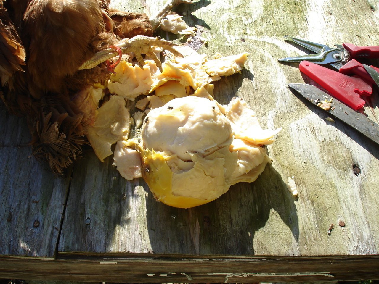 Two and a half year old, tight abdominal distention for 2 weeks. Could not walk well with extra weight but ate and drank small amounts regularly. Should have died if egg peritonitis but did not. Did an autopsy this AM. Removed from the vent/abdomen area a 6"x4" blob of what appeared to be an unattached chunk of layers of cooked chicken. all other internal organs seemed normal behind the blob but went no further. Hopefully 3 pictures will show up. What is it???